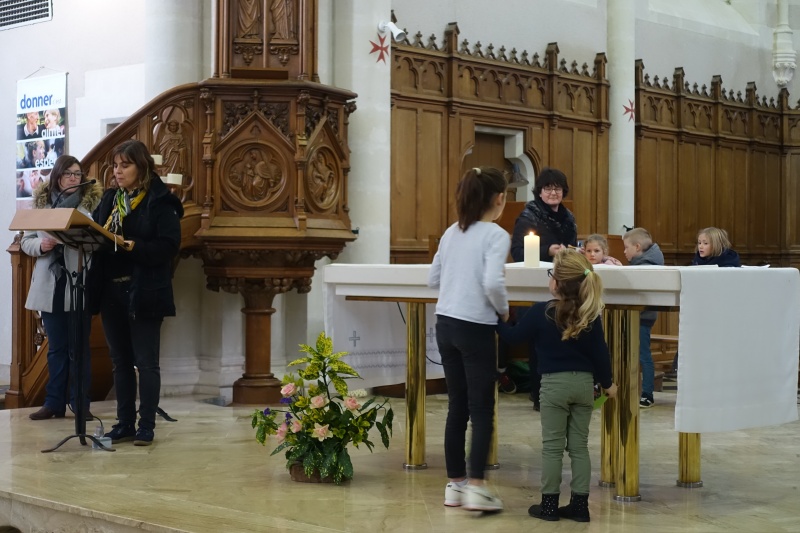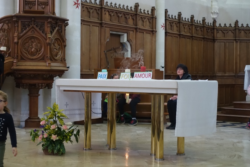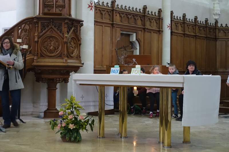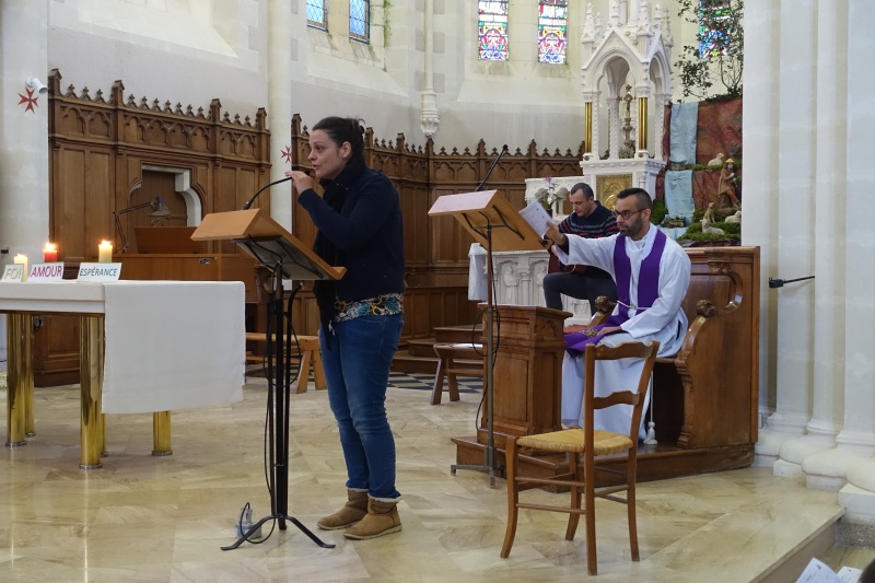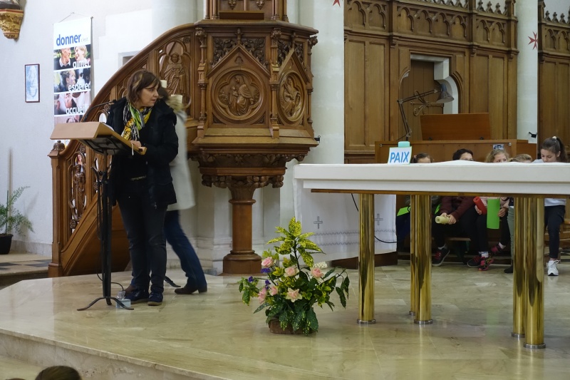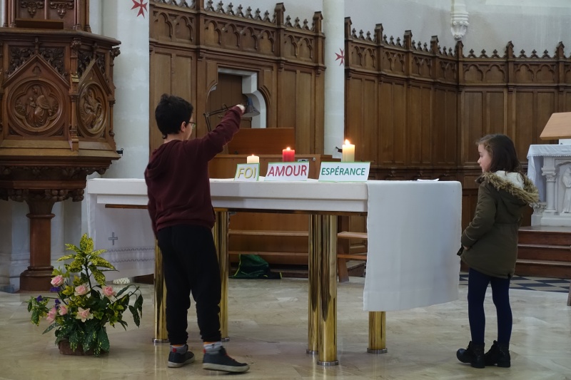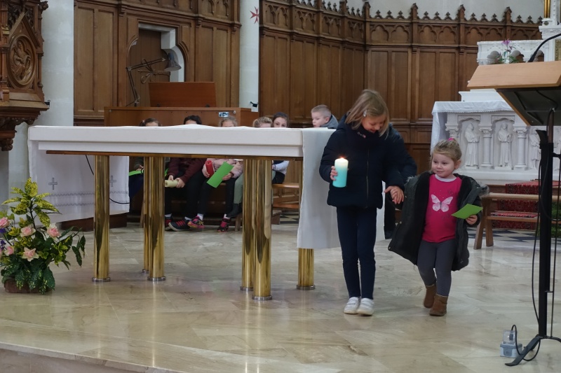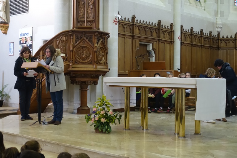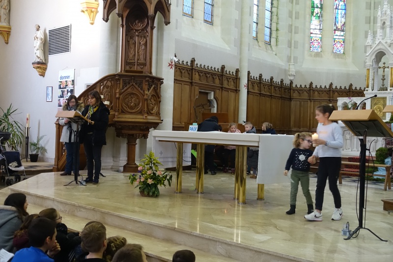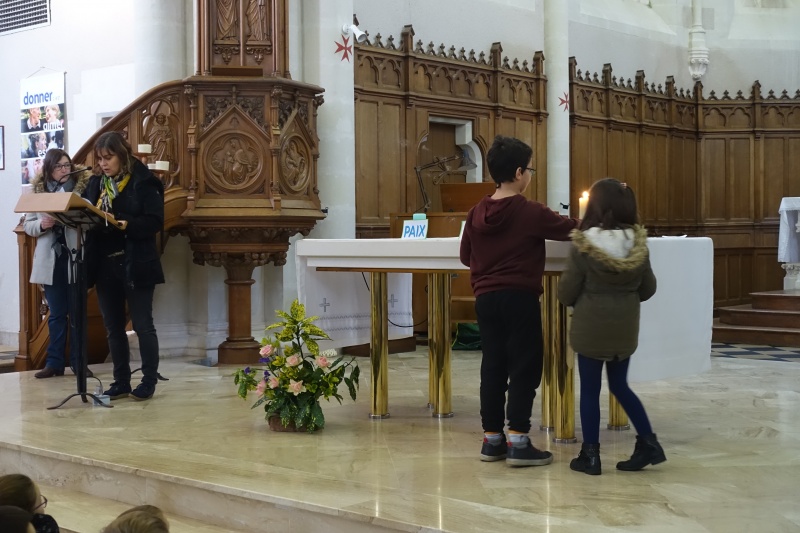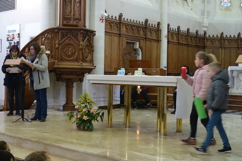 Des enseignantes ont lu l’histoire des 4 bougies dont les 3 premières, la Paix, la Foi et l’Amour s’était éteintes, heureusement, la 4ème, l’Espérance est arrivée et a pu les rallumer. Deux enfants apportaient, à chaque fois, une bougie et son titre correspondant. Des plus grands ont pu lire des prières préparées en catéchèse. Tous ont chanté Noël, cœur de pauvreté, Notre Père et C’est Noël ce soir.