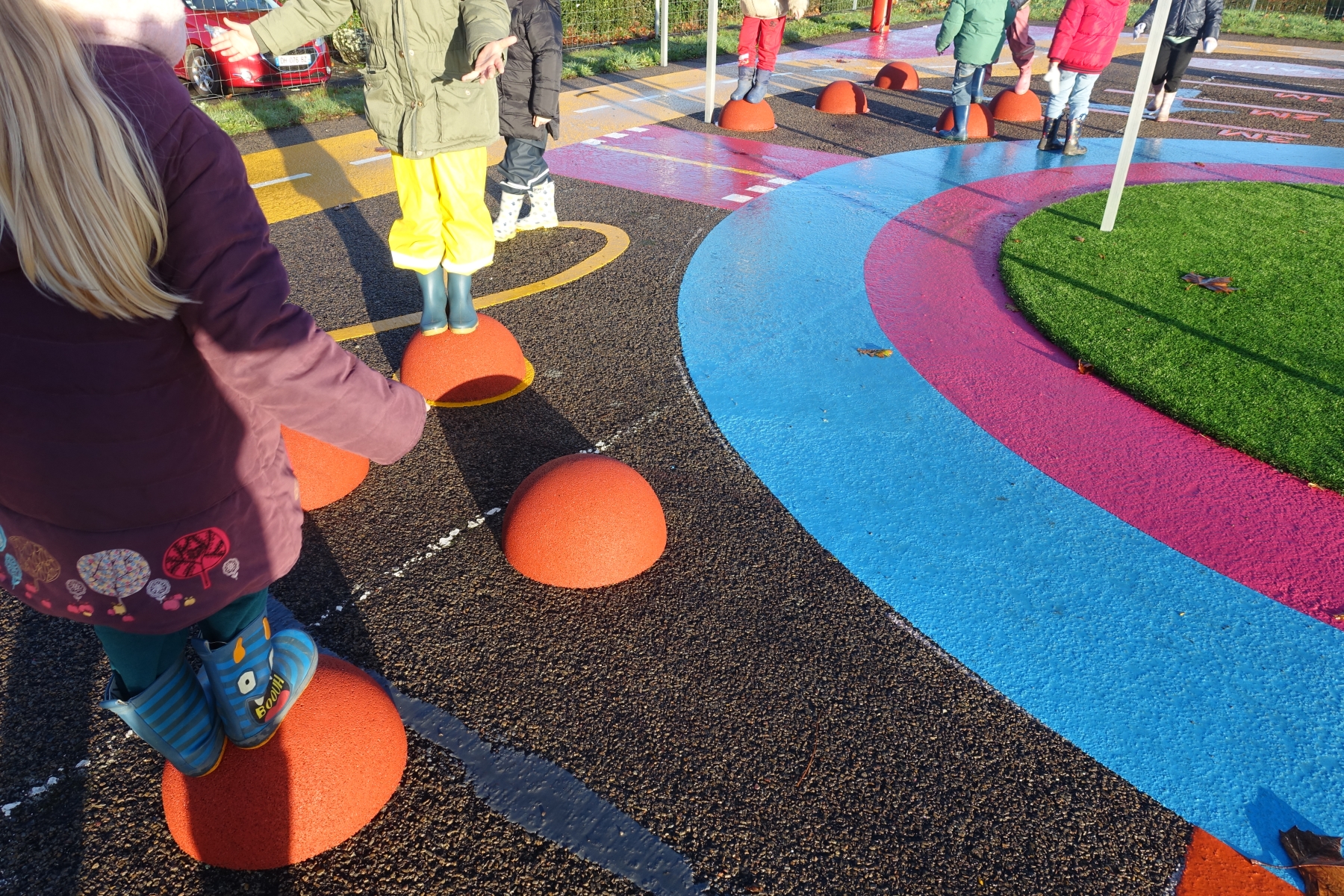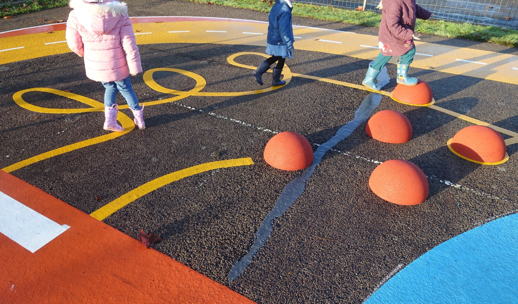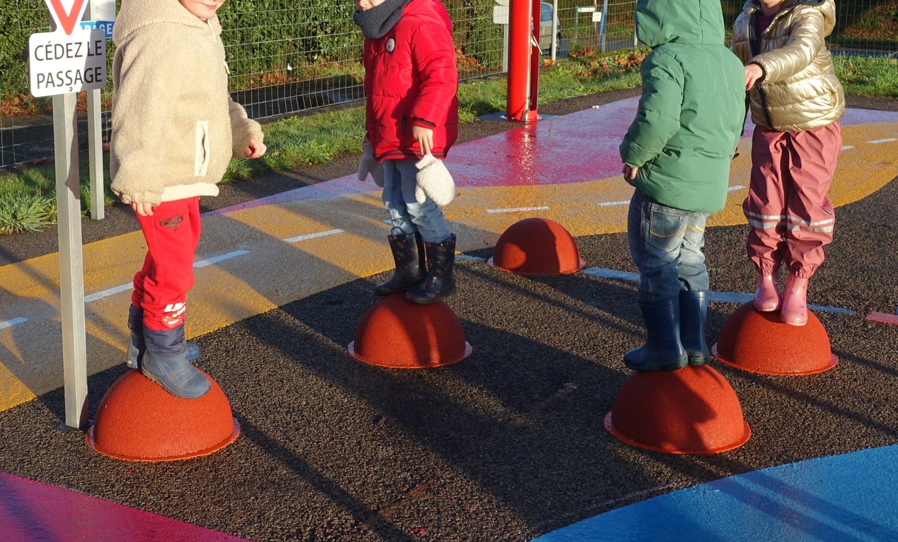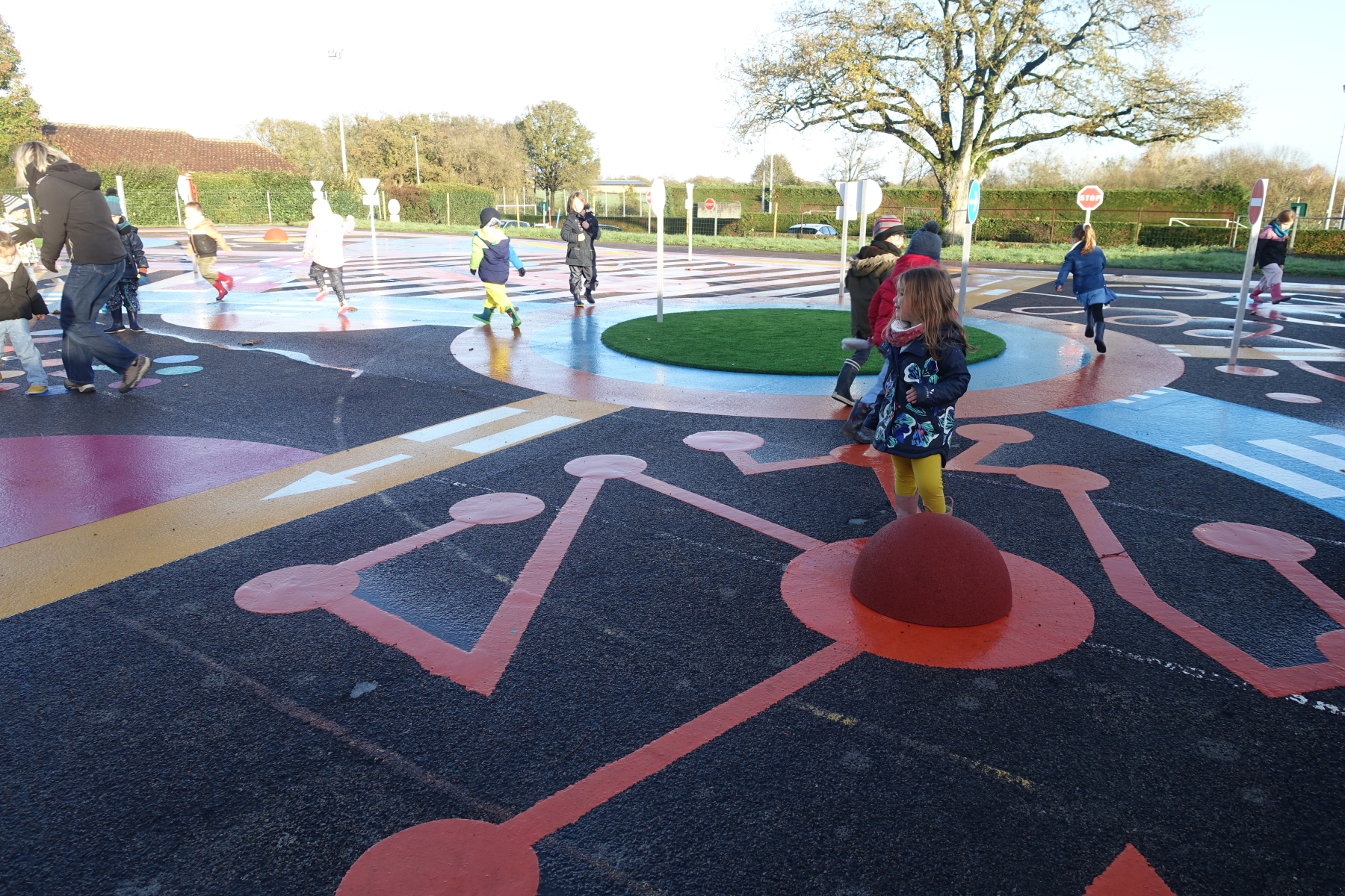 Lundi 24 novembre, nous sommes allés faire classe dehors le matin. Nous avons rejoint le parcours de vélo en silence et à la queue leu leu, nous nous sommes regroupés autour d’un rond-point pour dire notre petite comptine (la chanson hibou-coucou), puis nous avons exploré librement tout le parcours. Il y a beaucoup d’activités : suivre les routes, suivre les boucles, monter sur les demi-globes, enjamber, sauter, courir, jouer au miroir avec les pieds (copiez-moi)… Ensuite, nous avons préparé l’activité suivante en ramassant toutes les feuilles et brindilles tombés sur le parcours. Nous avons pris le temps d’observer un ver de terre qui avançait. Nous sommes allés sur la partie non aménagée (ancien terrain de basket) pour se mettre par deux et faire des motifs répétitifs (algorithmes) avec notre récolte et ce qui se trouvait là. Nous avons pris le temps de faire le tour de tous les motifs avant de faire une récréation. Ceux qui étaient équipés pouvaient s’amuser à sauter dans la petite flaque d’eau (rapidement épuisée) et les autres marchaient simplement dedans avec leurs bottes. Nous avons terminé par un dernier rassemblement autour d’un rond-point, pour rappeler ce que nous avons fait, pris le temps d’écouter autour de nous avant de nous asseoir pour écouter une petite histoire avant de rentrer en classe pour nous changer. Il a fait beau, c’était une belle matinée !