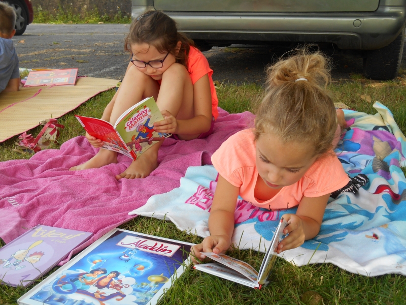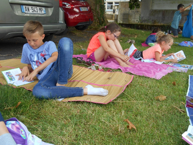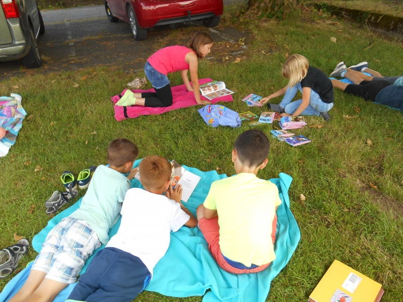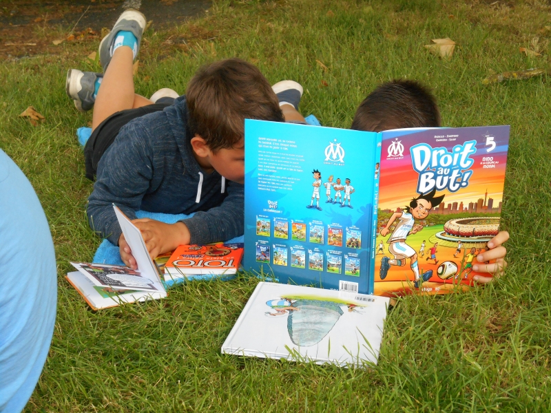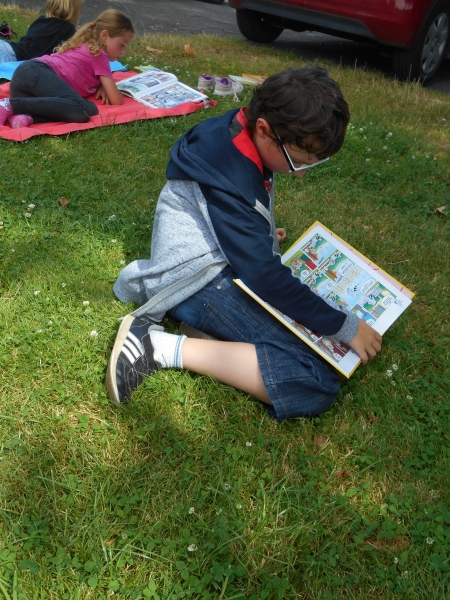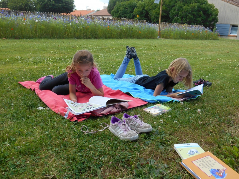 Puis lors de la dernière semaine, nous avons voulu continuer de nous faire plaisir en lisant et en partageant nos lectures, alors chaque élève a apporté une serviette et plusieurs livres de la maison et nous sommes allés lire sur l’herbe à l’ombre.