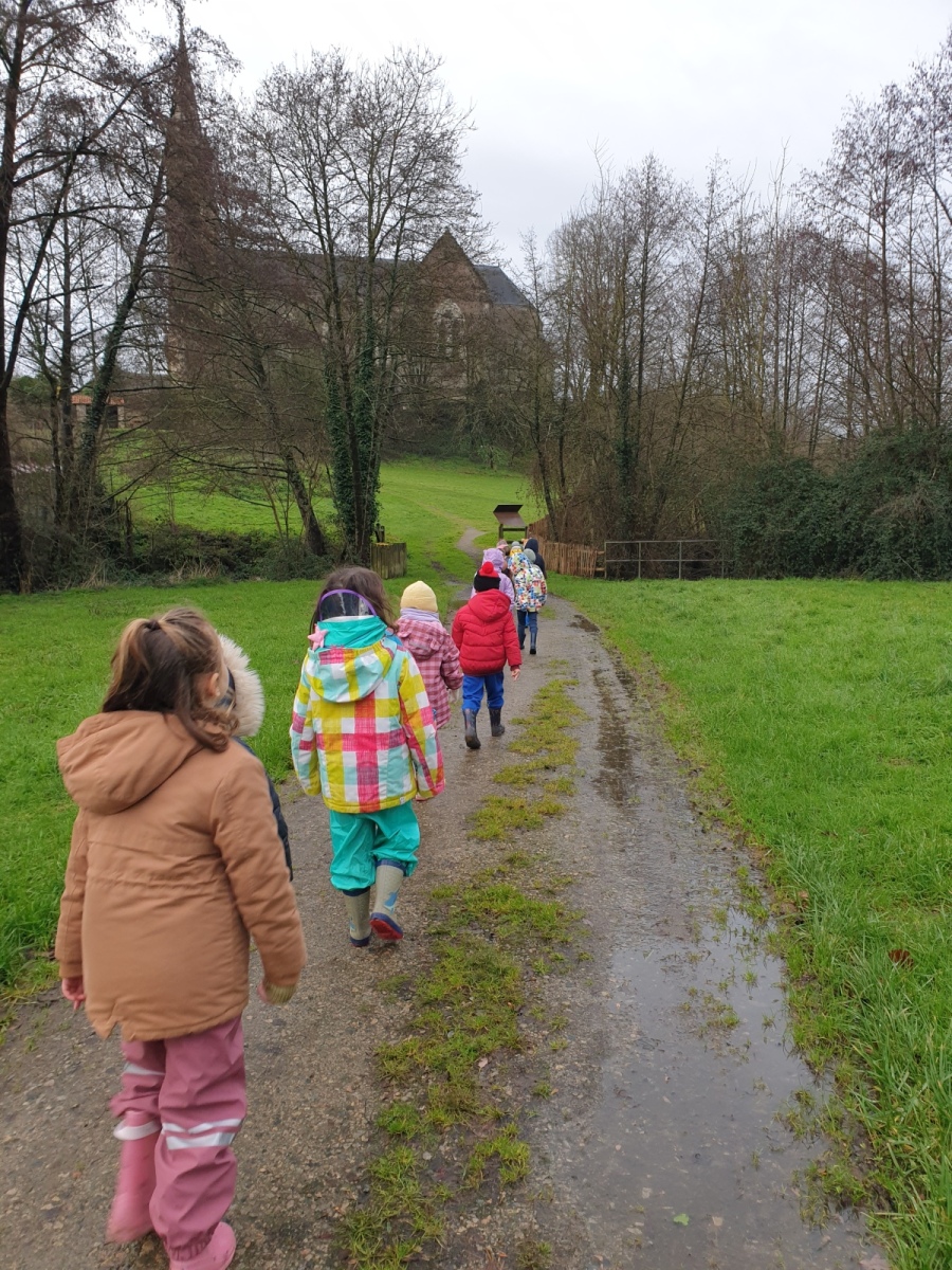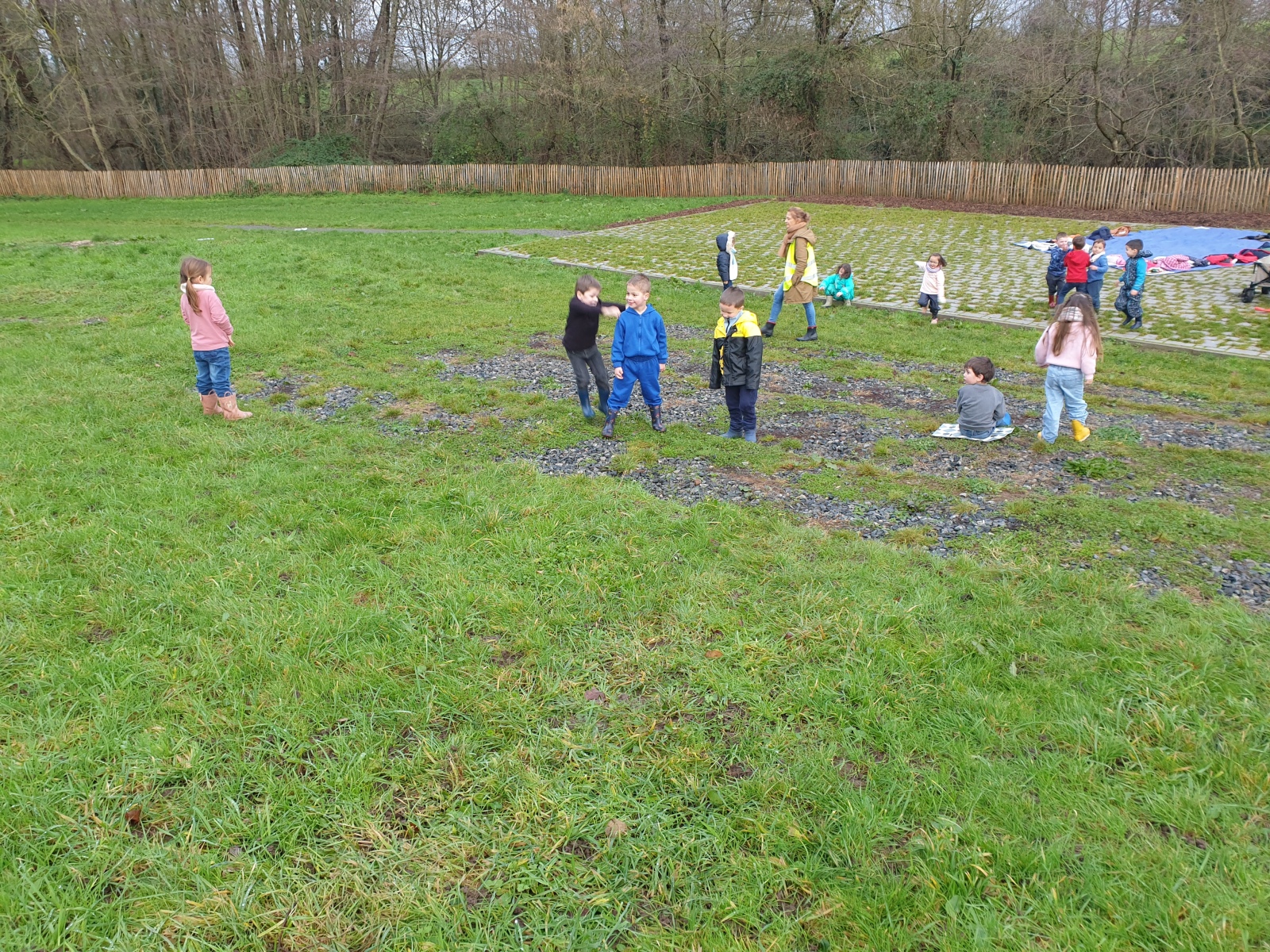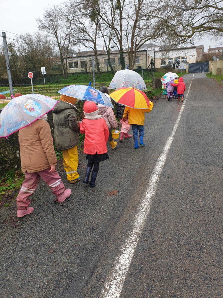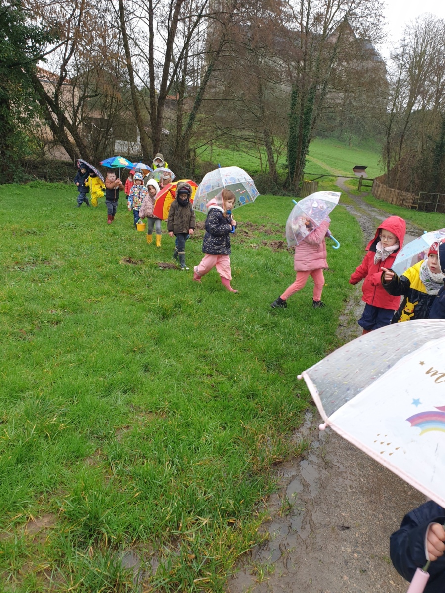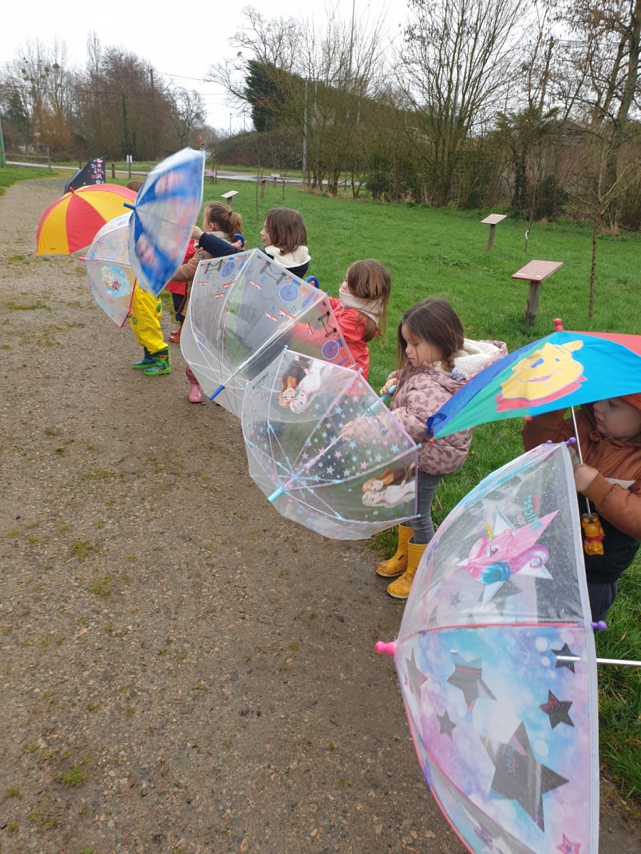 La matinée est passée très vite. Nous sommes rentrés à l’école. On a pris le temps de se changer ( là on se mélange un peu nos chaussettes mais on apprend à bien ranger !). Il y avait quand même un peu de boue avec cette pluie qui tombe depuis plusieurs jours !….Alors on a écouté la chanson de Jane Birkin : « La gadoue »!… - Lundi 9 février, nous avons de nouveau fait classe dehors. Il y a eu quelques averses de bruine, mais tous les enfants étaient bien équipés pour faire face à cette humidité. Nous avions 1 parapluie pour deux et les enfants ont appris à partager un parapluie avec un camarade, à avancer à deux sous le même parapluie, l’un devant l’autre, l’un à côté de l’autre. Ils ont fait également quelques mouvements (parapluie en l’air, parapluie qui tourne devant soi, se cacher…) avec l’accessoire. En observant les camélias sur le chemin, ils ont entendu des oiseaux qui chantaient fort et ont pu les apercevoir. Arrivés sur le site de la Pivre, nous avons vu que les sangliers étaient passés et avaient retourné l’herbe par endroits. Cela formait des mini mares où l’eau restait. Nous sommes allés sur la scène pour faire tourner les parapluies comme des toupies avant un temps de jeux libres. Les enfants ont pu faire un atelier peinture avec de l’eau boueuse, ils se sont installés à l’abri du Cadran solaire pour que les feuilles ne soient pas trempées par la pluie. Ceux qui le souhaitaient ont pu également faire une boule de boue. Ils se sont amusés à passer dans la boue et ressentir l’effet ventouse de la terre gorgée d’eau « je suis collé ! ». Ils ont pu sauter dans des flaques, revoir les gouttes d’eau qui faisaient des ronds, mais sur la mare cette fois. Nous avons vu les premières pâquerettes et des ficaires (fleurs jaunes), et les pousses observées la dernière fois ont bien grandi… Ils ont sauté, couru, et tout le monde est rentré au chaud pour se changer.