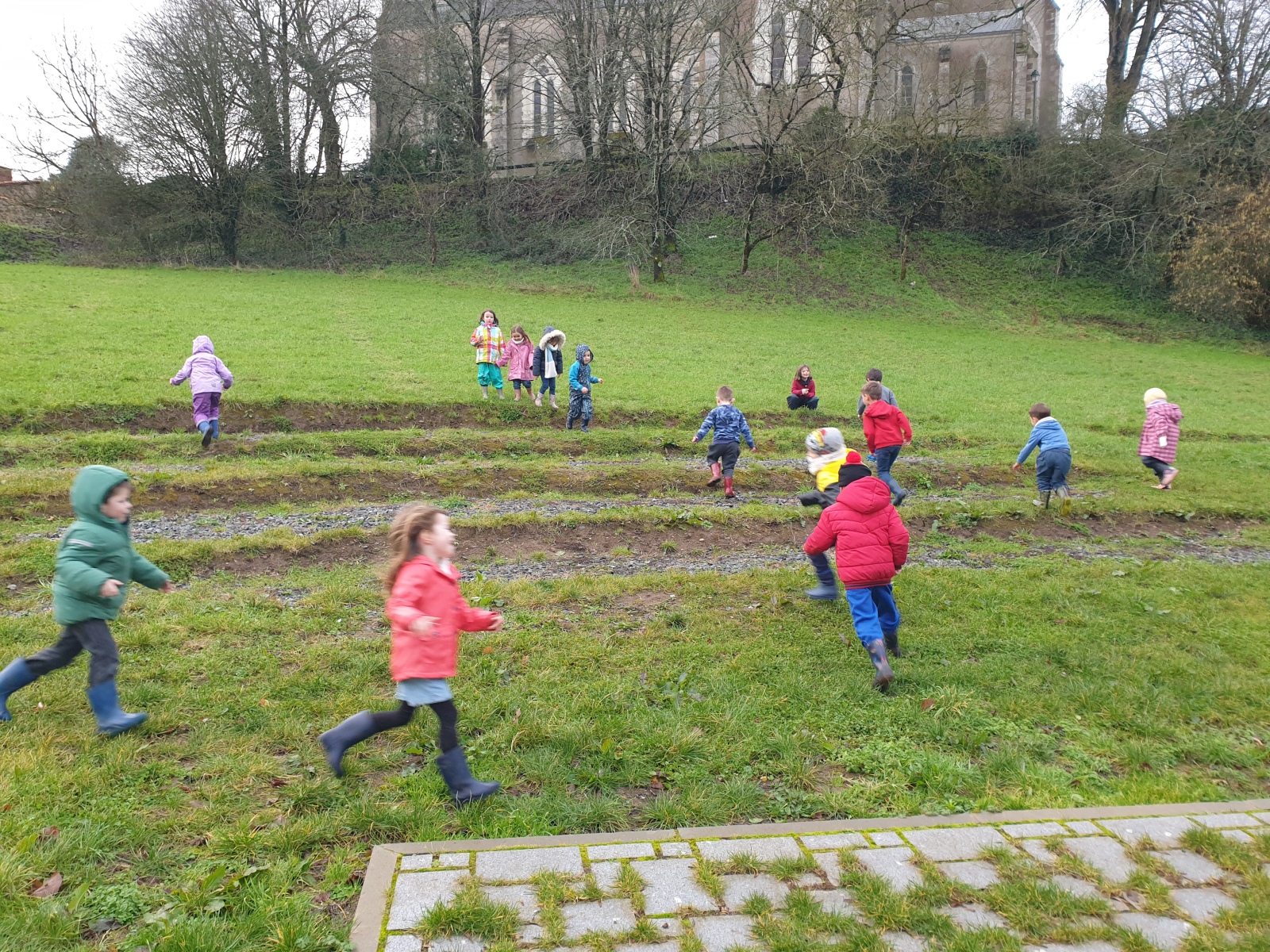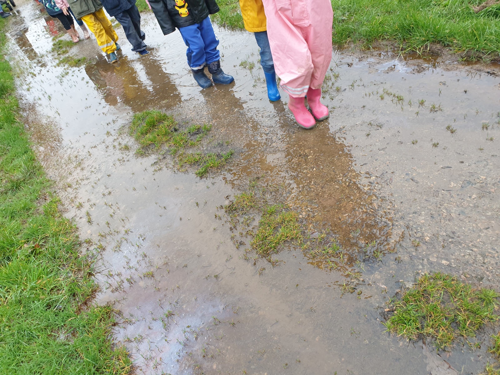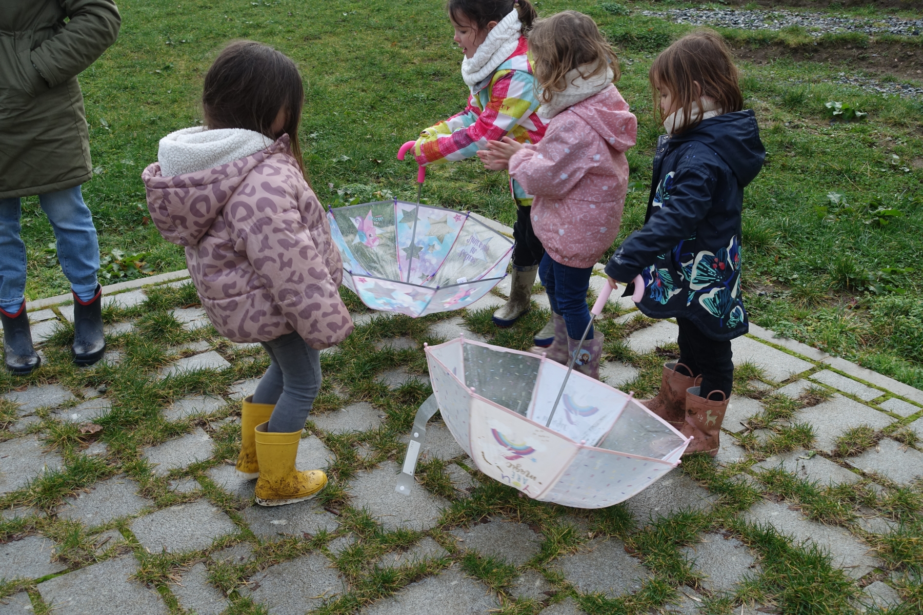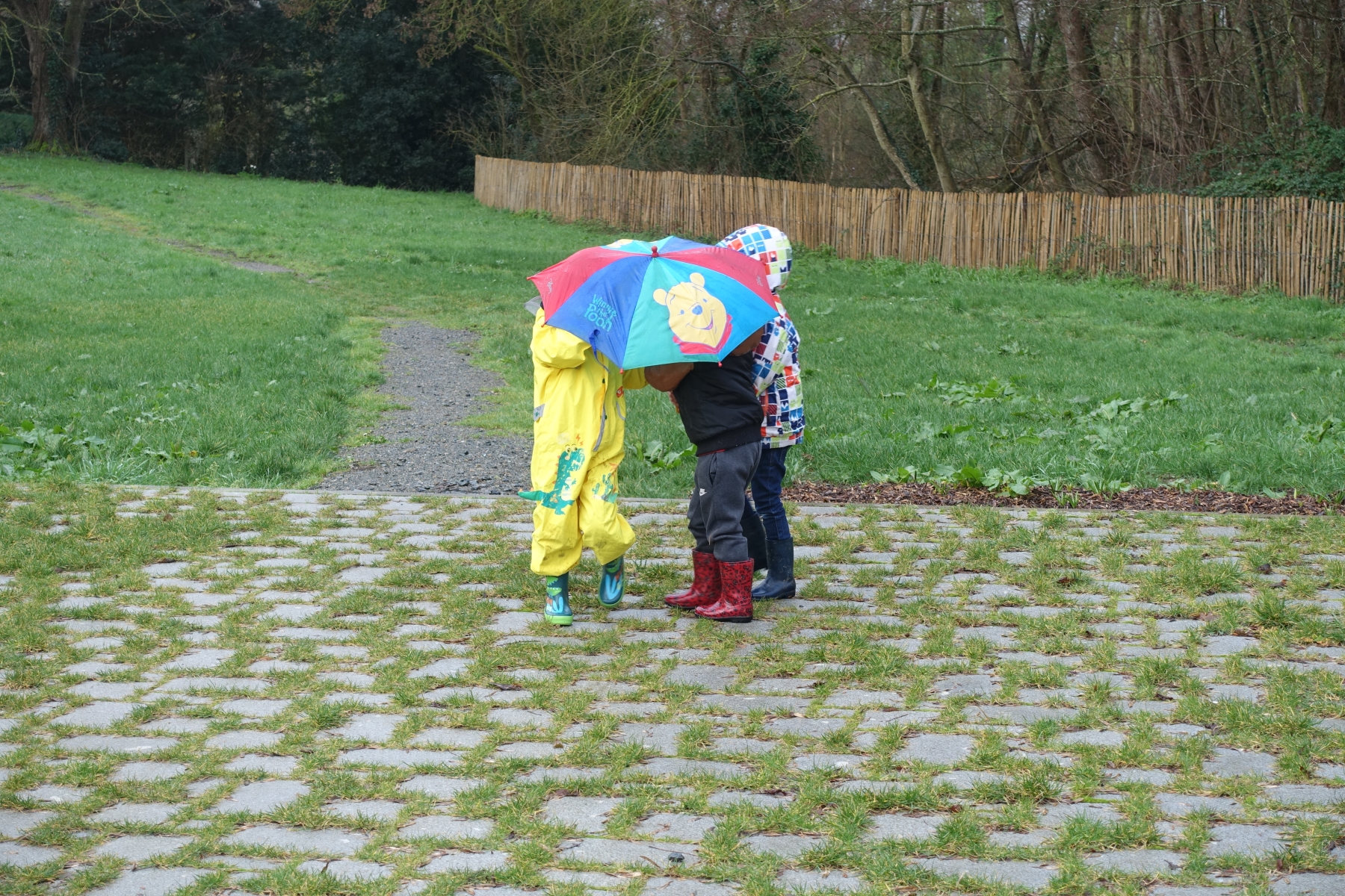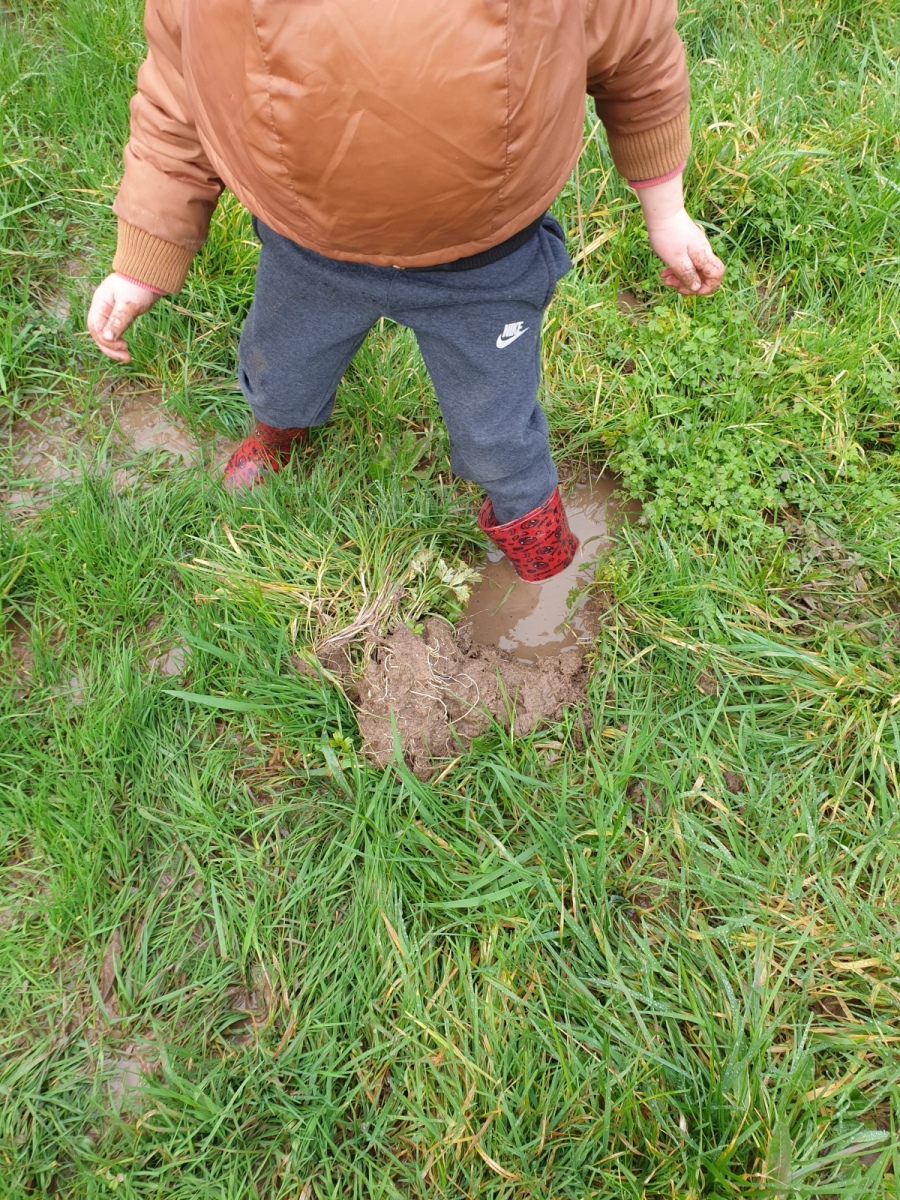 La matinée est passée très vite. Nous sommes rentrés à l’école. On a pris le temps de se changer ( là on se mélange un peu nos chaussettes mais on apprend à bien ranger !). Il y avait quand même un peu de boue avec cette pluie qui tombe depuis plusieurs jours !….Alors on a écouté la chanson de Jane Birkin : « La gadoue »!… - Lundi 9 février, nous avons de nouveau fait classe dehors. Il y a eu quelques averses de bruine, mais tous les enfants étaient bien équipés pour faire face à cette humidité. Nous avions 1 parapluie pour deux et les enfants ont appris à partager un parapluie avec un camarade, à avancer à deux sous le même parapluie, l’un devant l’autre, l’un à côté de l’autre. Ils ont fait également quelques mouvements (parapluie en l’air, parapluie qui tourne devant soi, se cacher…) avec l’accessoire. En observant les camélias sur le chemin, ils ont entendu des oiseaux qui chantaient fort et ont pu les apercevoir. Arrivés sur le site de la Pivre, nous avons vu que les sangliers étaient passés et avaient retourné l’herbe par endroits. Cela formait des mini mares où l’eau restait. Nous sommes allés sur la scène pour faire tourner les parapluies comme des toupies avant un temps de jeux libres. Les enfants ont pu faire un atelier peinture avec de l’eau boueuse, ils se sont installés à l’abri du Cadran solaire pour que les feuilles ne soient pas trempées par la pluie. Ceux qui le souhaitaient ont pu également faire une boule de boue. Ils se sont amusés à passer dans la boue et ressentir l’effet ventouse de la terre gorgée d’eau « je suis collé ! ». Ils ont pu sauter dans des flaques, revoir les gouttes d’eau qui faisaient des ronds, mais sur la mare cette fois. Nous avons vu les premières pâquerettes et des ficaires (fleurs jaunes), et les pousses observées la dernière fois ont bien grandi… Ils ont sauté, couru, et tout le monde est rentré au chaud pour se changer.