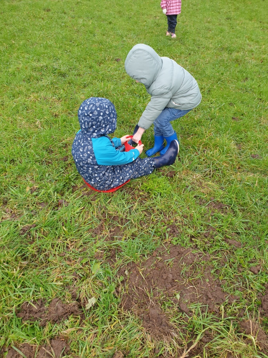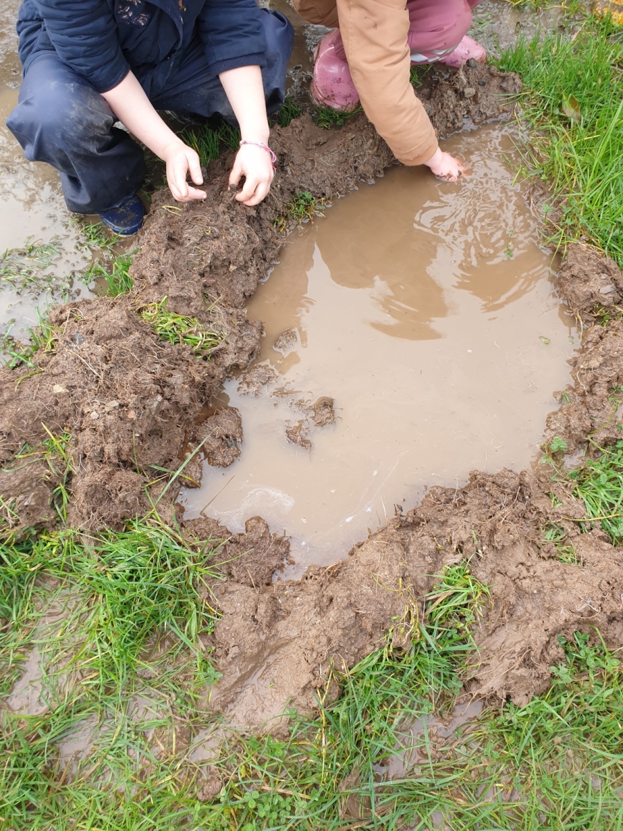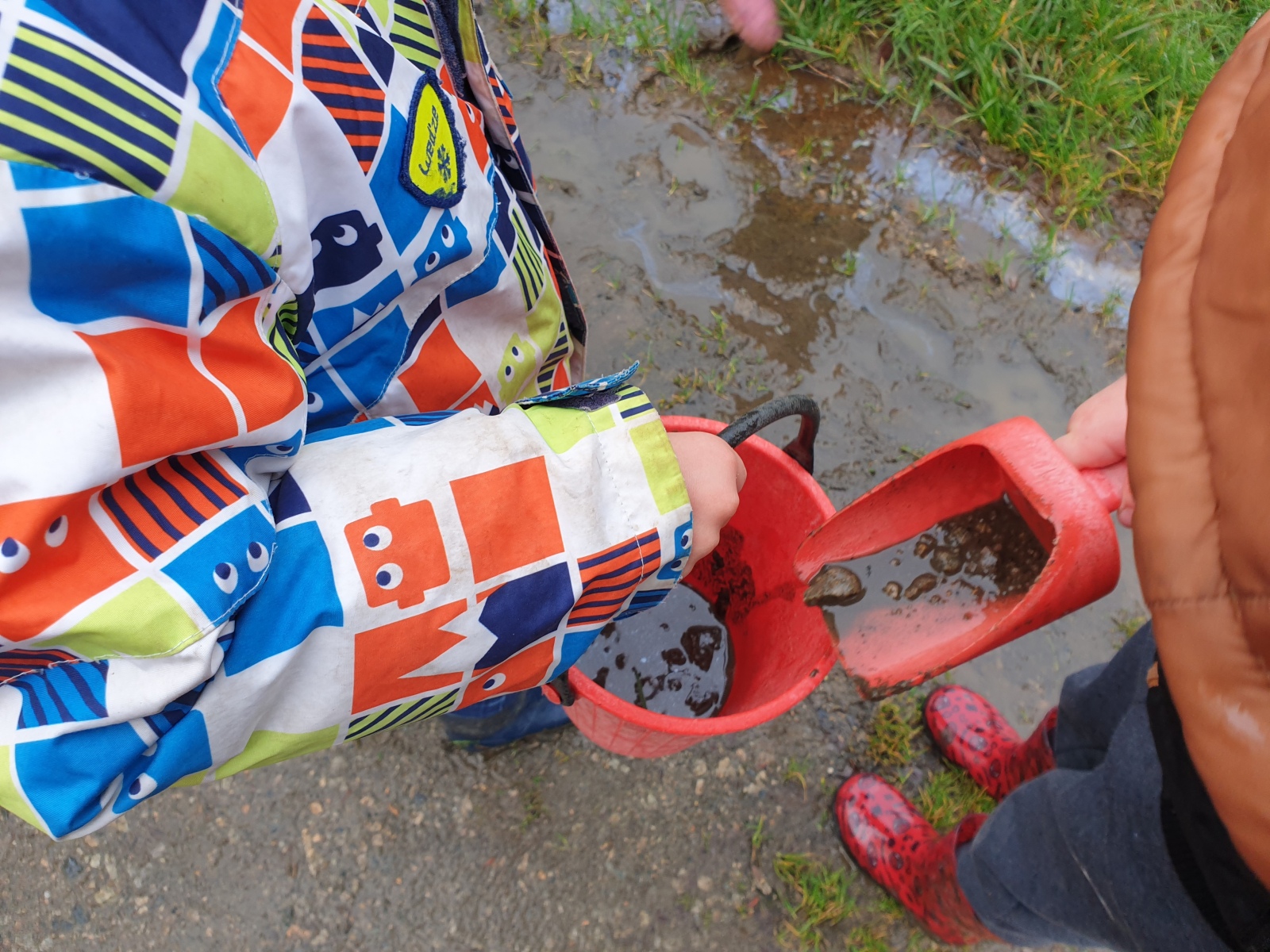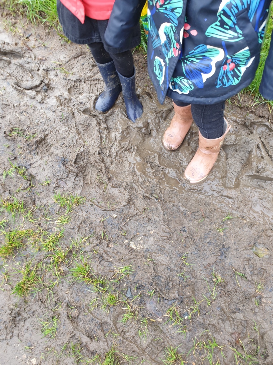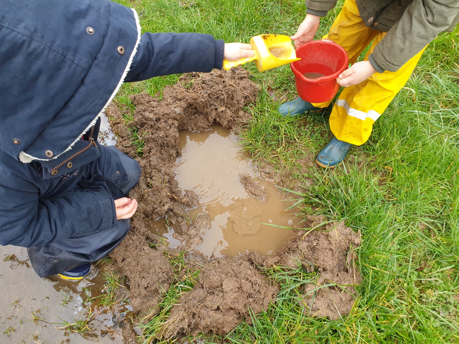 La matinée est passée très vite. Nous sommes rentrés à l’école. On a pris le temps de se changer ( là on se mélange un peu nos chaussettes mais on apprend à bien ranger !). Il y avait quand même un peu de boue avec cette pluie qui tombe depuis plusieurs jours !….Alors on a écouté la chanson de Jane Birkin : « La gadoue »!… - Lundi 9 février, nous avons de nouveau fait classe dehors. Il y a eu quelques averses de bruine, mais tous les enfants étaient bien équipés pour faire face à cette humidité. Nous avions 1 parapluie pour deux et les enfants ont appris à partager un parapluie avec un camarade, à avancer à deux sous le même parapluie, l’un devant l’autre, l’un à côté de l’autre. Ils ont fait également quelques mouvements (parapluie en l’air, parapluie qui tourne devant soi, se cacher…) avec l’accessoire. En observant les camélias sur le chemin, ils ont entendu des oiseaux qui chantaient fort et ont pu les apercevoir. Arrivés sur le site de la Pivre, nous avons vu que les sangliers étaient passés et avaient retourné l’herbe par endroits. Cela formait des mini mares où l’eau restait. Nous sommes allés sur la scène pour faire tourner les parapluies comme des toupies avant un temps de jeux libres. Les enfants ont pu faire un atelier peinture avec de l’eau boueuse, ils se sont installés à l’abri du Cadran solaire pour que les feuilles ne soient pas trempées par la pluie. Ceux qui le souhaitaient ont pu également faire une boule de boue. Ils se sont amusés à passer dans la boue et ressentir l’effet ventouse de la terre gorgée d’eau « je suis collé ! ». Ils ont pu sauter dans des flaques, revoir les gouttes d’eau qui faisaient des ronds, mais sur la mare cette fois. Nous avons vu les premières pâquerettes et des ficaires (fleurs jaunes), et les pousses observées la dernière fois ont bien grandi… Ils ont sauté, couru, et tout le monde est rentré au chaud pour se changer.