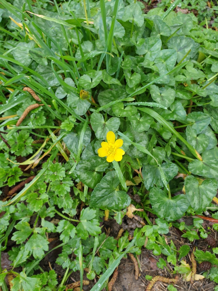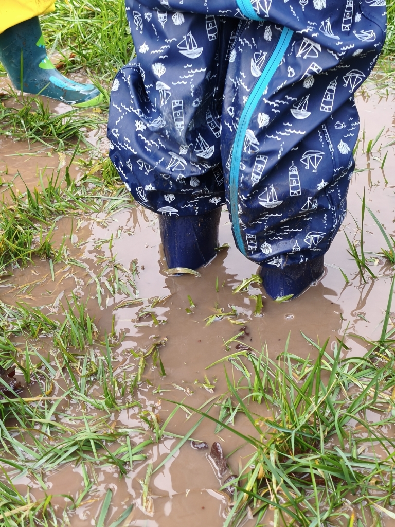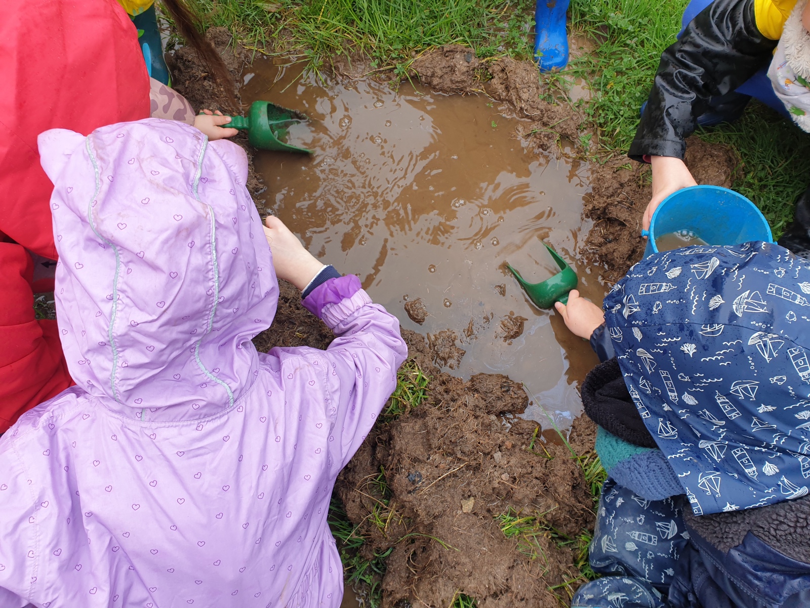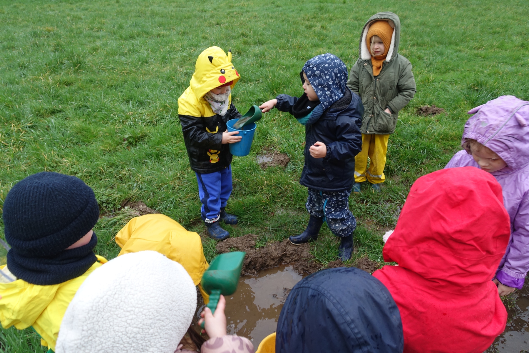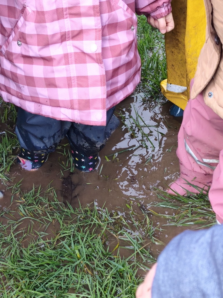 La matinée est passée très vite. Nous sommes rentrés à l’école. On a pris le temps de se changer ( là on se mélange un peu nos chaussettes mais on apprend à bien ranger !). Il y avait quand même un peu de boue avec cette pluie qui tombe depuis plusieurs jours !….Alors on a écouté la chanson de Jane Birkin : « La gadoue »!… - Lundi 9 février, nous avons de nouveau fait classe dehors. Il y a eu quelques averses de bruine, mais tous les enfants étaient bien équipés pour faire face à cette humidité. Nous avions 1 parapluie pour deux et les enfants ont appris à partager un parapluie avec un camarade, à avancer à deux sous le même parapluie, l’un devant l’autre, l’un à côté de l’autre. Ils ont fait également quelques mouvements (parapluie en l’air, parapluie qui tourne devant soi, se cacher…) avec l’accessoire. En observant les camélias sur le chemin, ils ont entendu des oiseaux qui chantaient fort et ont pu les apercevoir. Arrivés sur le site de la Pivre, nous avons vu que les sangliers étaient passés et avaient retourné l’herbe par endroits. Cela formait des mini mares où l’eau restait. Nous sommes allés sur la scène pour faire tourner les parapluies comme des toupies avant un temps de jeux libres. Les enfants ont pu faire un atelier peinture avec de l’eau boueuse, ils se sont installés à l’abri du Cadran solaire pour que les feuilles ne soient pas trempées par la pluie. Ceux qui le souhaitaient ont pu également faire une boule de boue. Ils se sont amusés à passer dans la boue et ressentir l’effet ventouse de la terre gorgée d’eau « je suis collé ! ». Ils ont pu sauter dans des flaques, revoir les gouttes d’eau qui faisaient des ronds, mais sur la mare cette fois. Nous avons vu les premières pâquerettes et des ficaires (fleurs jaunes), et les pousses observées la dernière fois ont bien grandi… Ils ont sauté, couru, et tout le monde est rentré au chaud pour se changer.