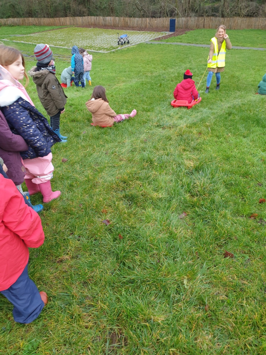 Sophie avait apporté sa luge et 3 pelles de glissade et nous avons essayé de glisser sur l’herbe dans la pente et nous avons réussi en se faisant tirer par quelqu’un, c’était très amusant ! Nous avons bien coopéré !