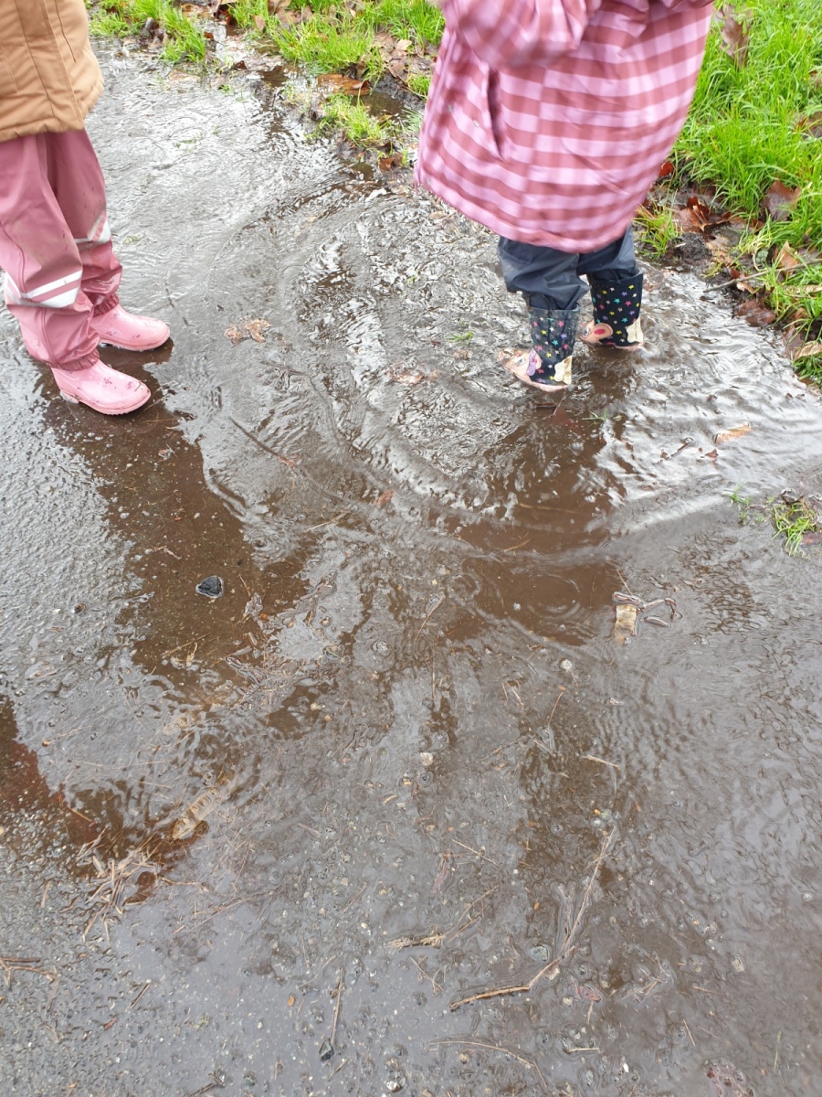 Sur le chemin, devant les arbres de naissance on a vu des grosses flaques. On a observé les petits ronds que faisaient les gouttes en tombant sur l’eau. Puis on a remarqué que l’eau faisait un miroir. On voyait les copains dans la flaque. Ensuite, en avançant sur le chemin il fallait compter les canards qui nageaient sur l’eau. On en a compté 6 : 3 mâles et 3 femelles.