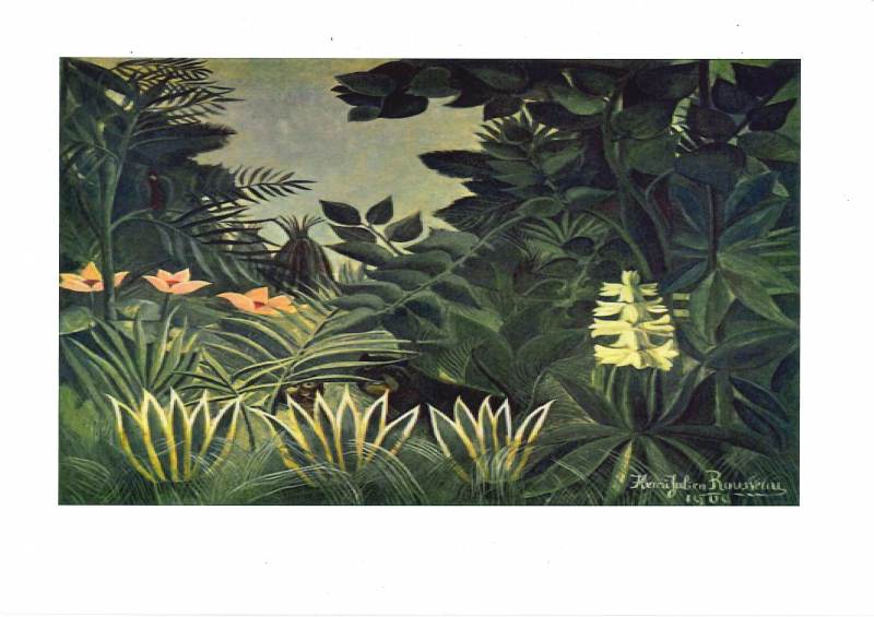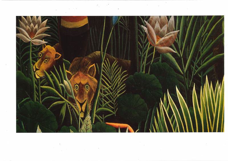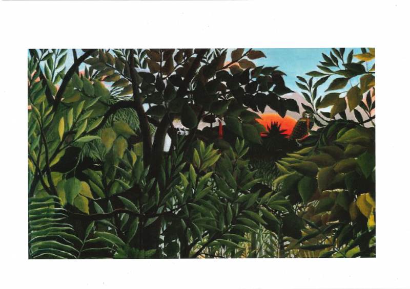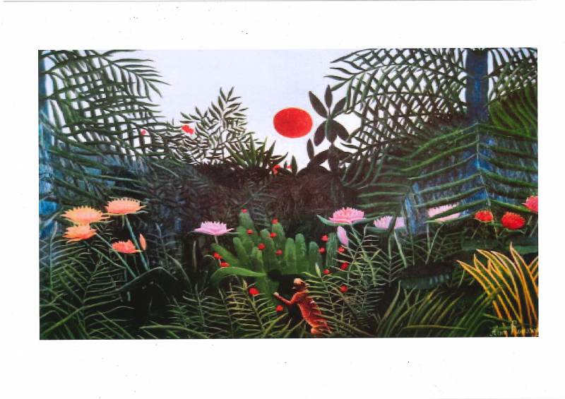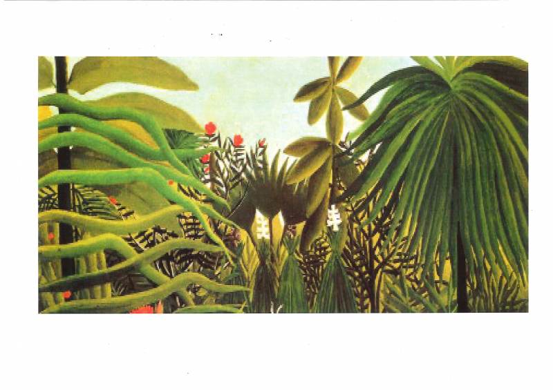 En arts visuels, nous avons dessiné une jungle en nous inspirant du Douanier Rousseau (Henri Rousseau (Douanier Rousseau) : biographie | Beaux Arts). Il fallait remplir notre feuille de végétation.