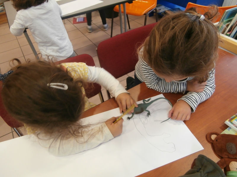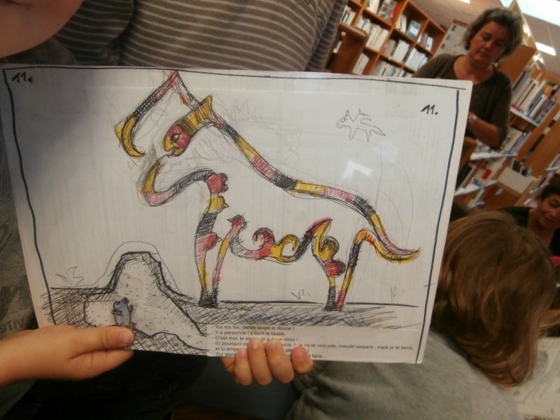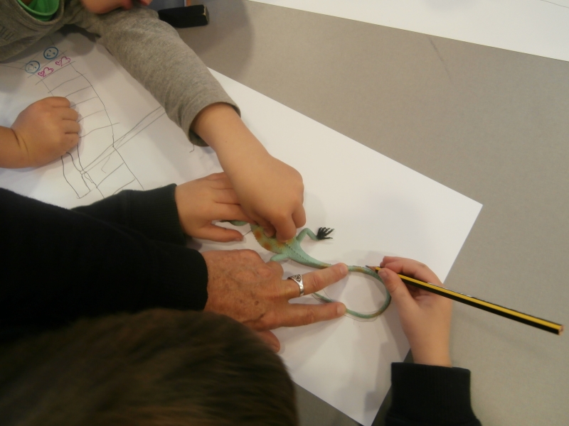 Aude nous a expliqué comment dessiner la tête du serpent : elle pose sa main (de profil) sur le support et trace le contour…puis son corps…et la silhouette de l’objet engloutie.