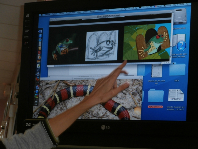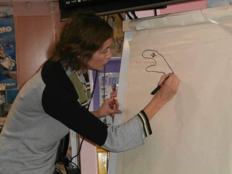 Aude nous a appris comment elle a illustré l’album : elle s’entraîne et fait des brouillons. Nous avons regardé quelques dessins.