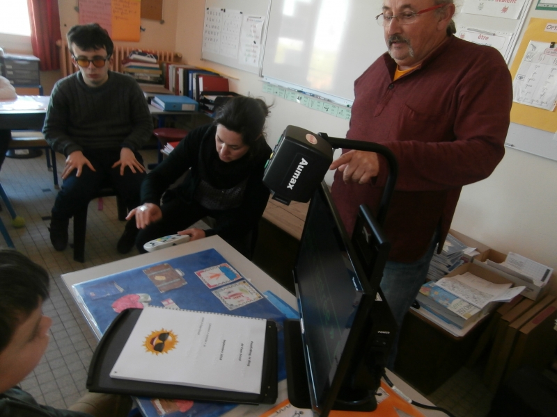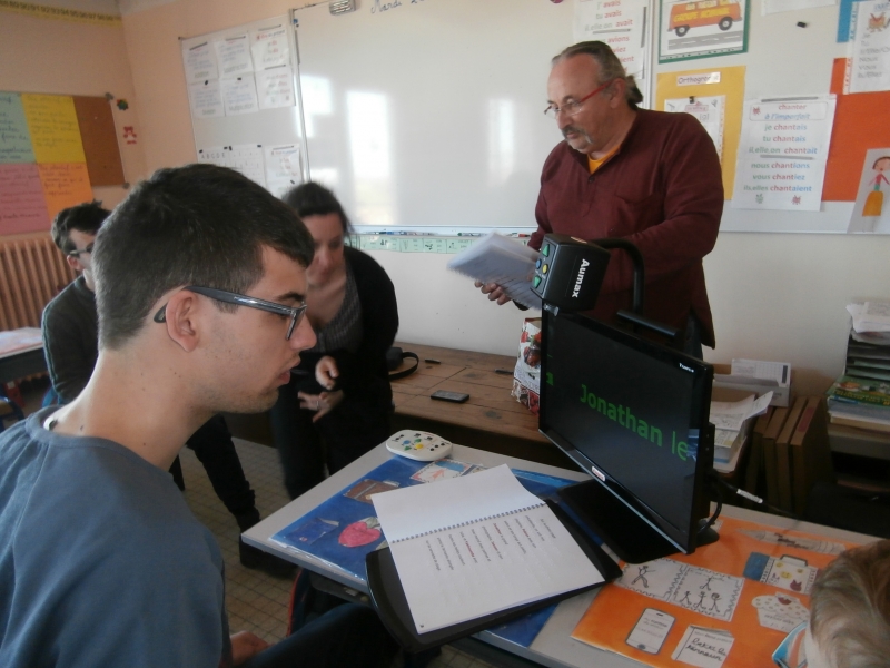 Raphaël nous a montré comment il parvenait à lire avec un vidéo agrandisseur. C’est un appareil muni d’une caméra et qui permet de visualiser par grossissement n’importe quel document sur un écran.