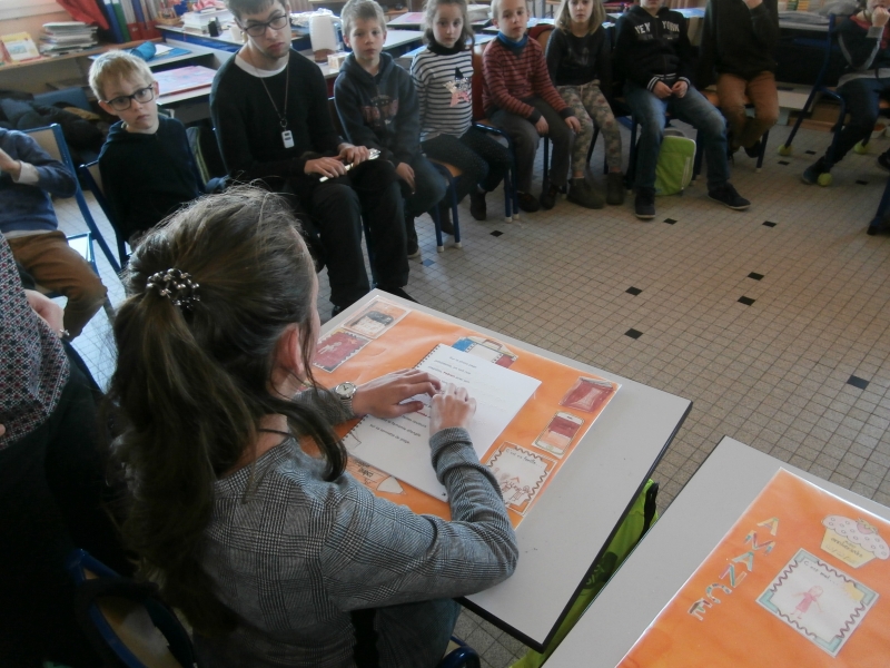 Nous avons terminé la journée en partageant le goûter que nous avions confectionné la veille en classe. Ils nous ont fait l’heureuse surprise de nous offrir, à chacun, un marque page avec notre prénom en braille.