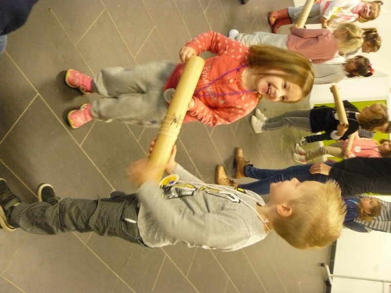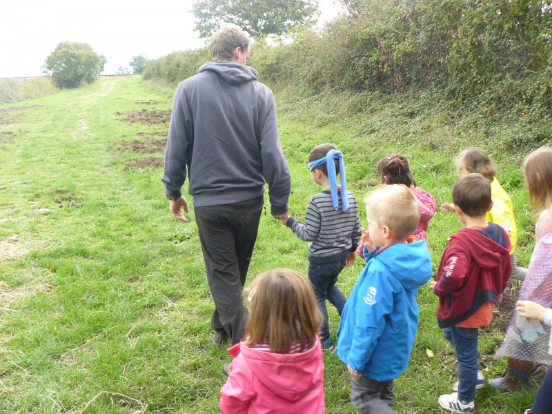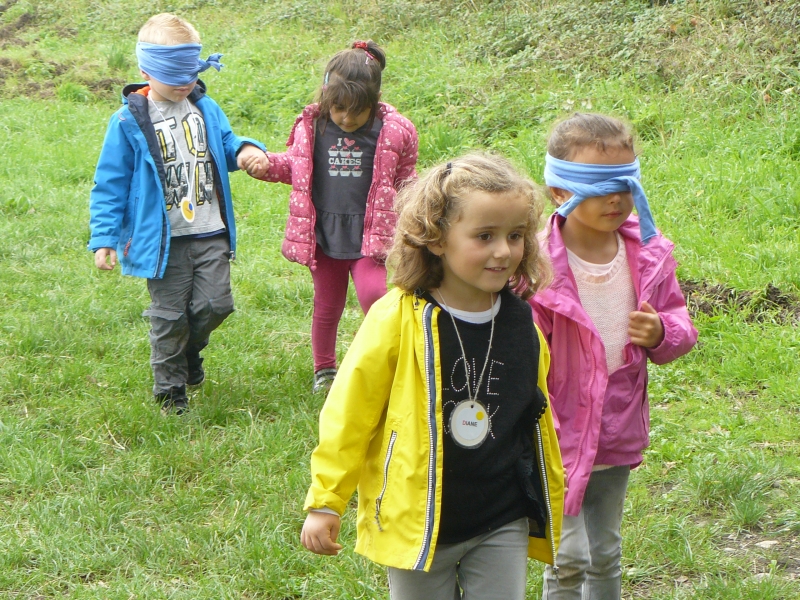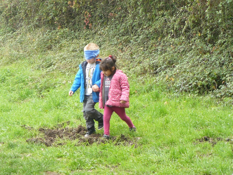 Nous avons fait le jeu sensoriel de la chauve souris : 1 enfant a les yeux bandés, le 2ème le guide et le déplace sur le chemin.