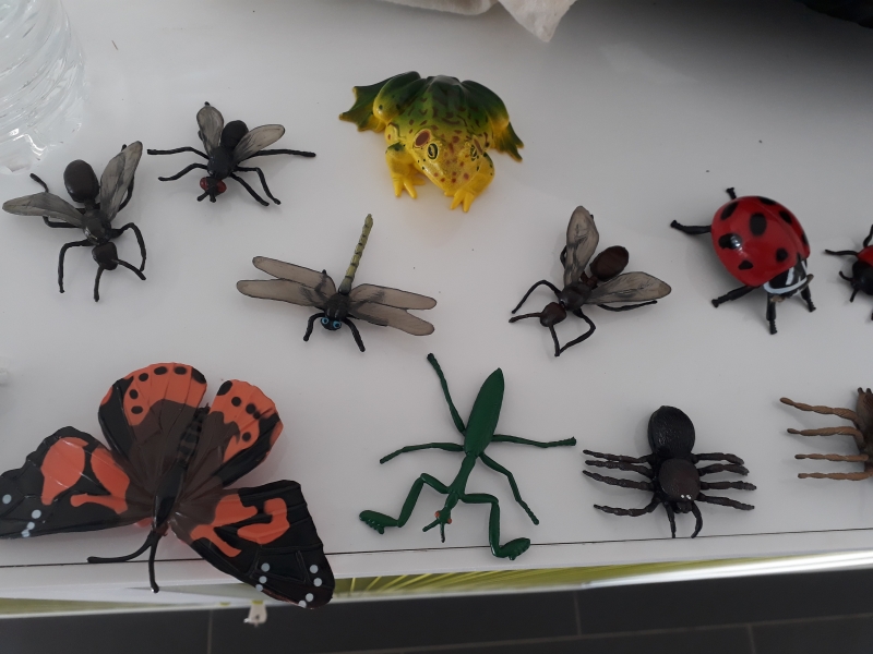 Nous commençons la journée par la reconnaissons de petites bêtes, à l’aide de petits animaux en plastique. Nous comptons leur pattes : l’araignée en possède 8, la grenouille 4, et les autres (la mouche, la fourmi, la fourmi volante, la mante religieuse, le scorpion, la libellule, le papillon ) en possèdent 6. Antoine nous explique ce qu’ils mangent . Nous savons aussi que les insectes ont 6 pattes.