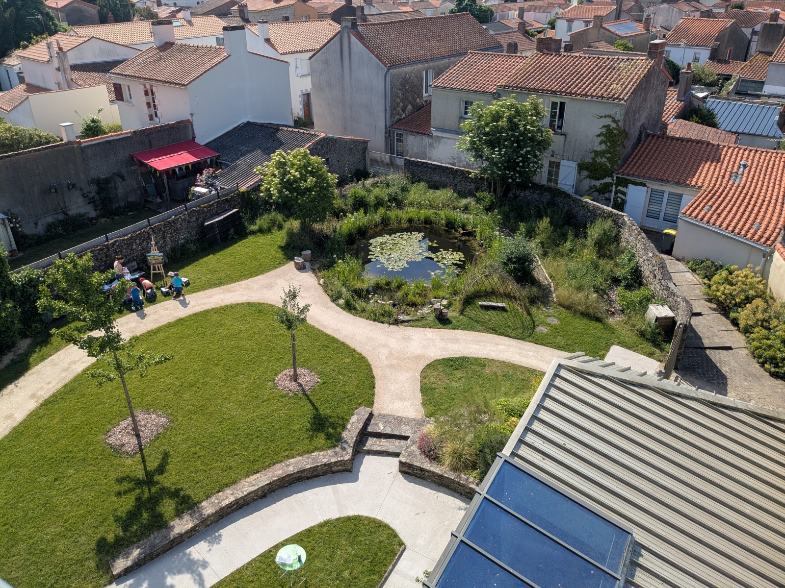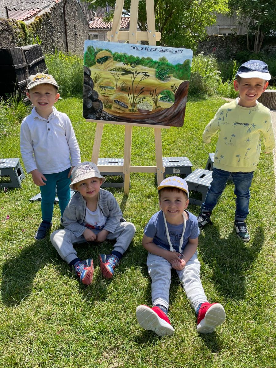 L’atelier Fripouille la grenouille :. En se promenant en silence autour d’une très jolie petite mare, maison de Fripouille la grenouille, les élèves ont découvert la famille des amphibiens. Observation des plantes (ex : nénuphars, roseaux…) et des petites bêtes (des libellules, des demoiselles…). Puis, assis sur de petits tabourets, ils ont découvert, à partir de matériel à disposition, le cycle de vie de la grenouille.