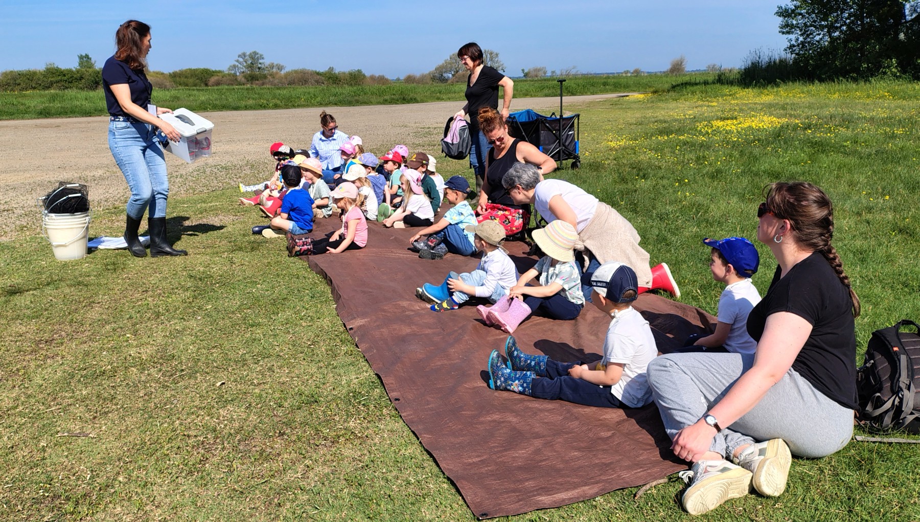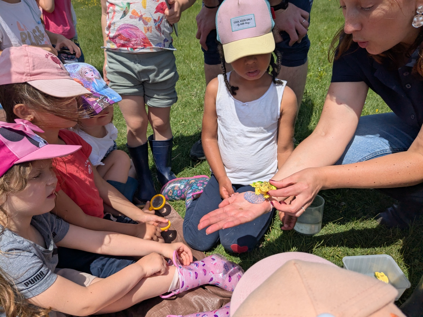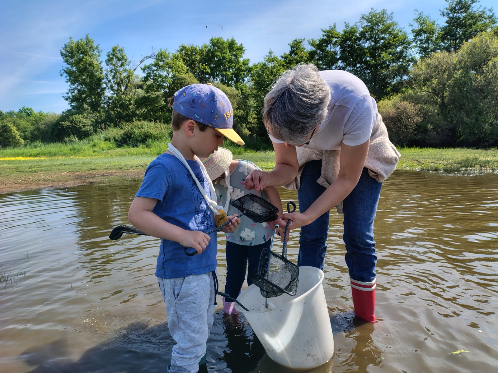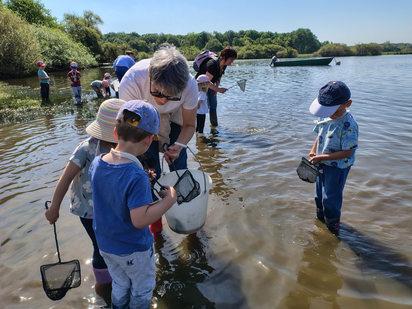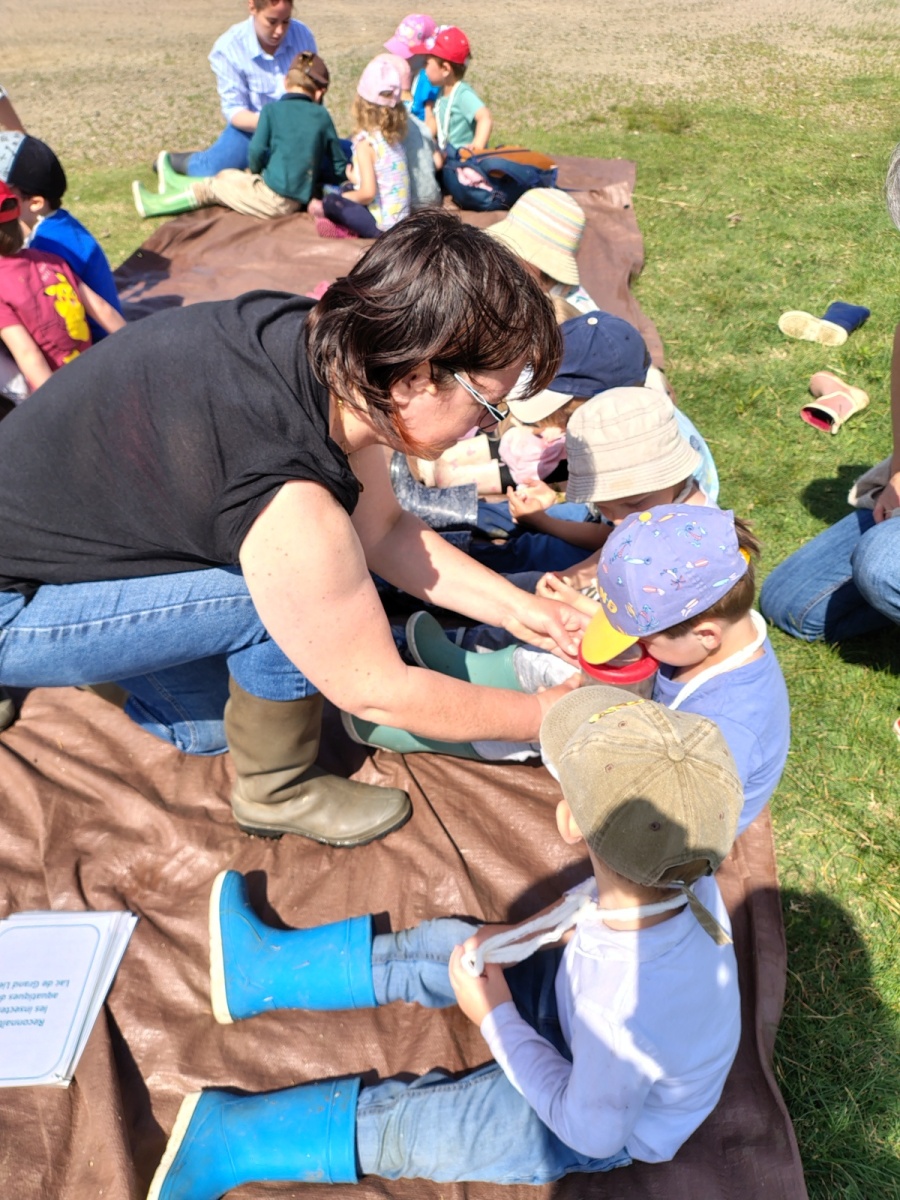 Au cours de cette pêche aux petites bêtes, les enfants étaient partagés en petits groupes, munis d’épuisettes et de seaux . Au terme de cette pêche fort appréciée malgré l’eau dans les bottes, ils les ont ensuite observées dans des « boîtes loupes, » avant de les relâcher dans le lac ! Marlène leur a aussi donné les caractéristiques d’un insecte pour les différencier et les reconnaître des autres petites bêtes (6 pattes, 2 antennes et 2 ailes)