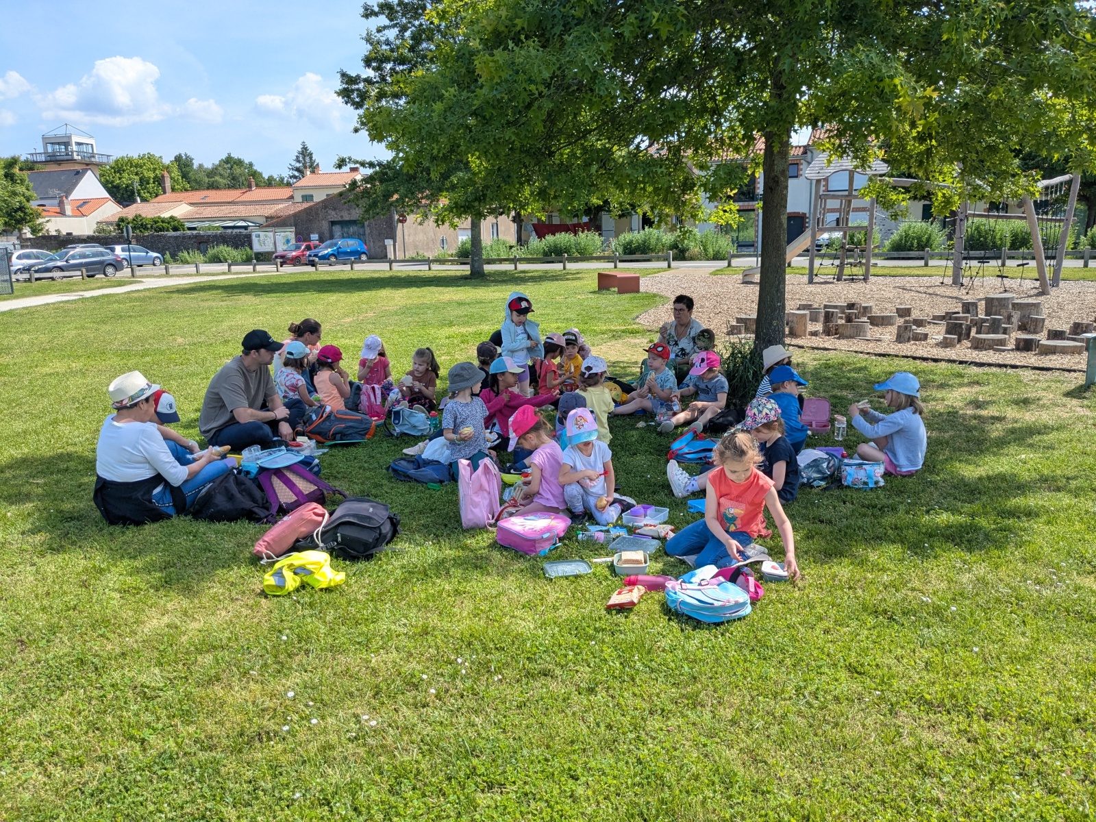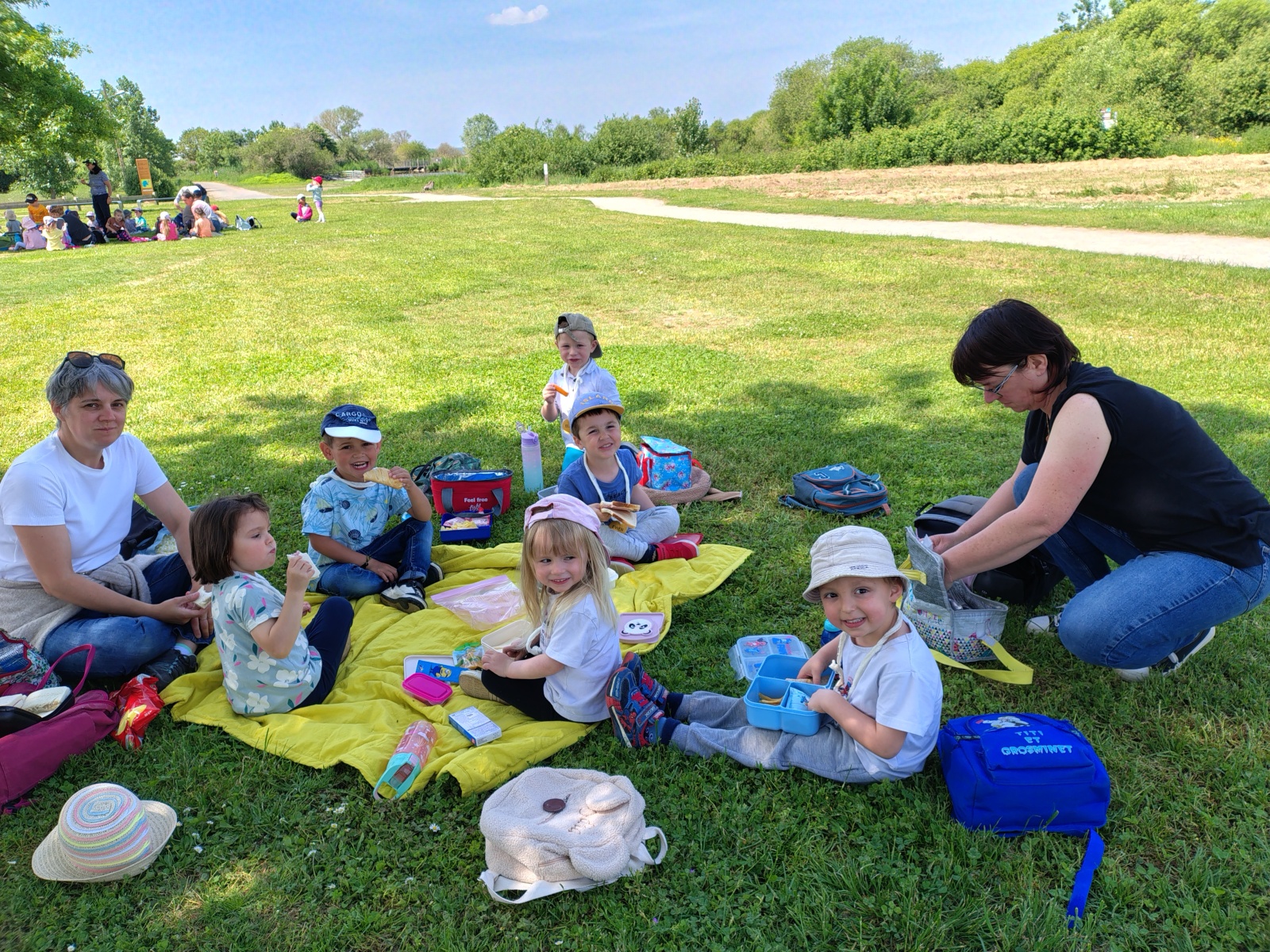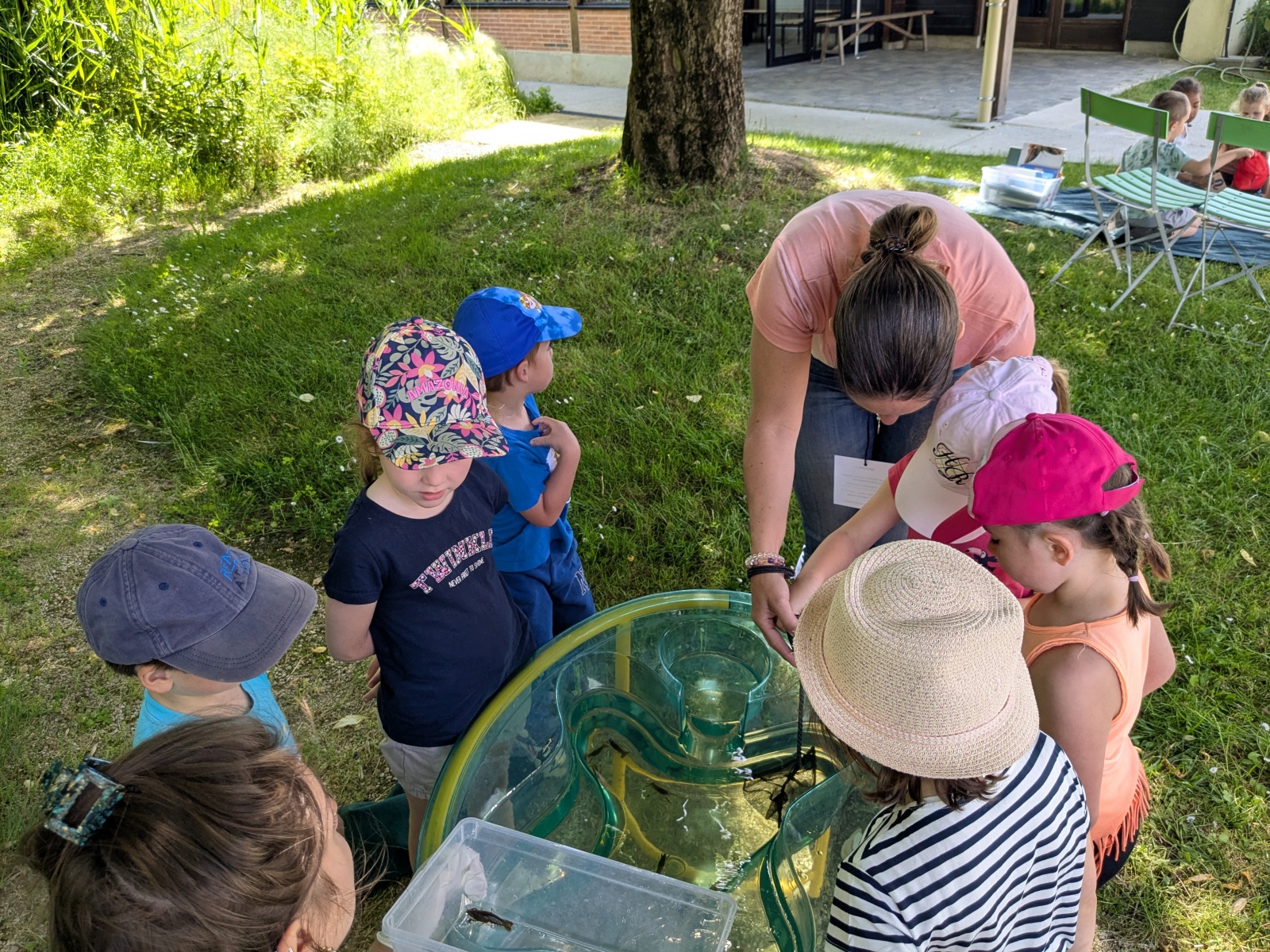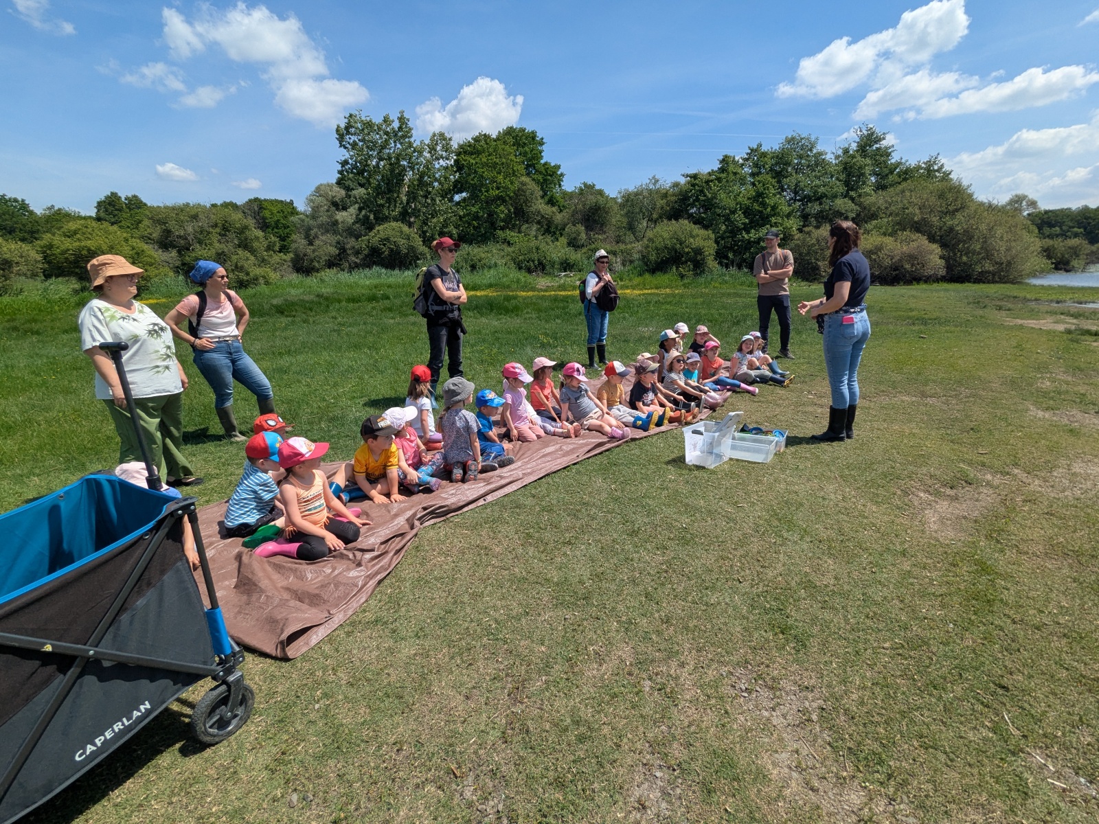 Nous sommes ensuite allés pique-niquer à l’ombre. Puis les PS ont participé à leur tour aux ateliers, pendant que les MS partaient à la pêche sur les bords du lac avec Charlène. Mettre les pieds dans l’eau et pêcher étaient autorisés car les enfants étaient avec une animatrice du Centre. Il n’y a que 6 8 pêcheurs qui ont l’habilitation à pêcher sur le lac !
