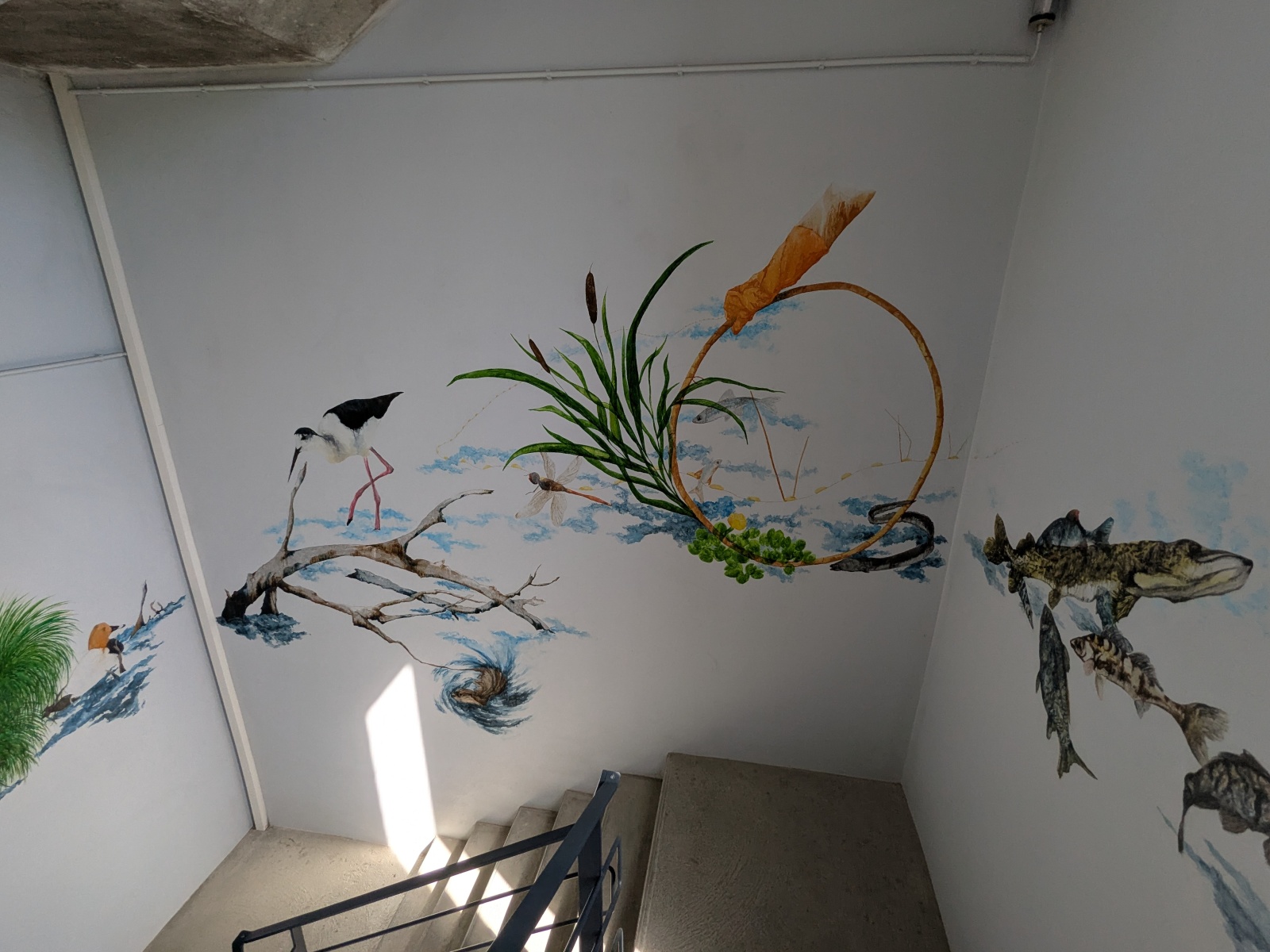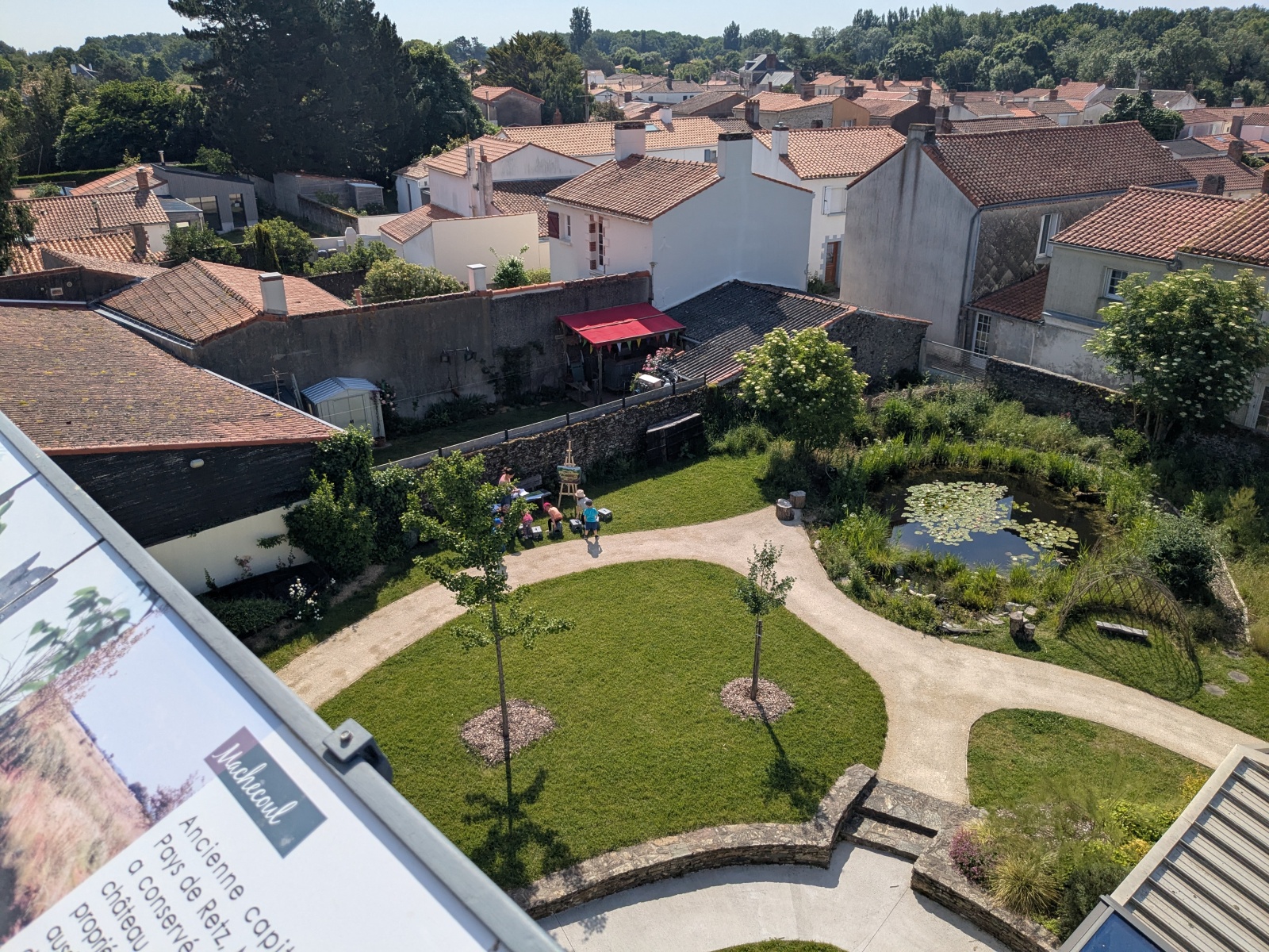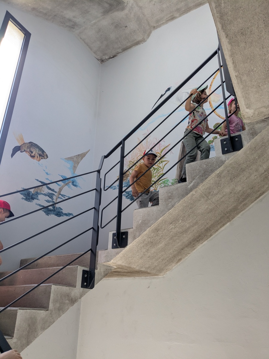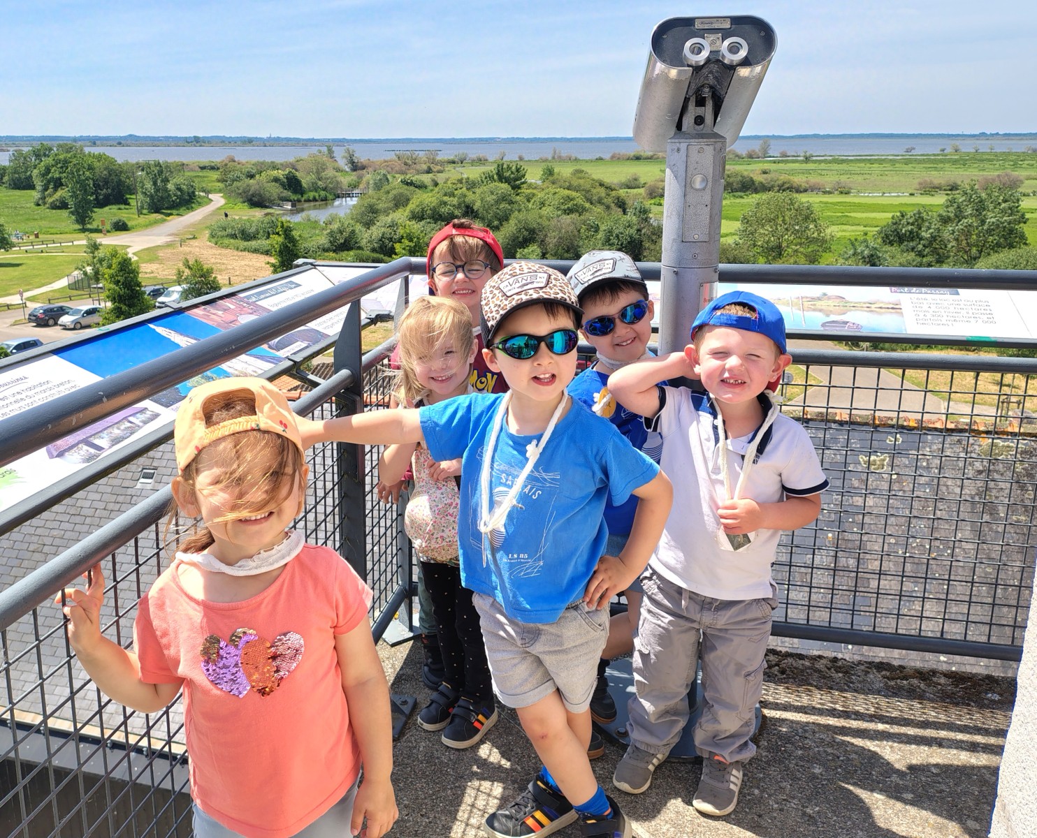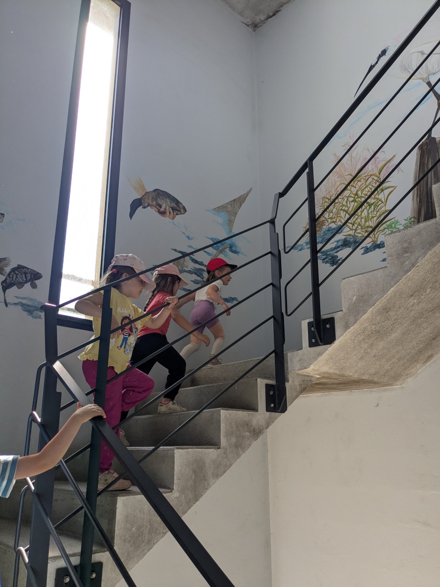 Après ce temps de découverte de la mare, ils ont pu monté dans une grande tour pour découvrir le grand lac ! Les élèves de MS ont observé les oiseaux avec des grandes jumelles !