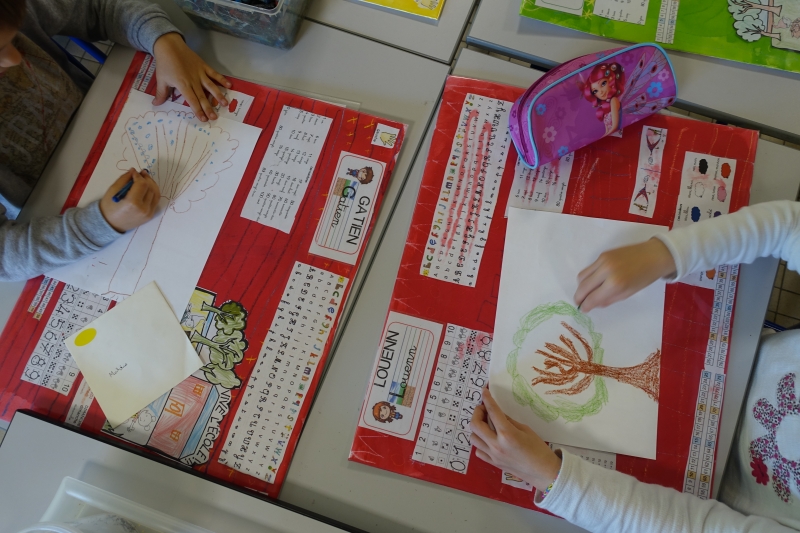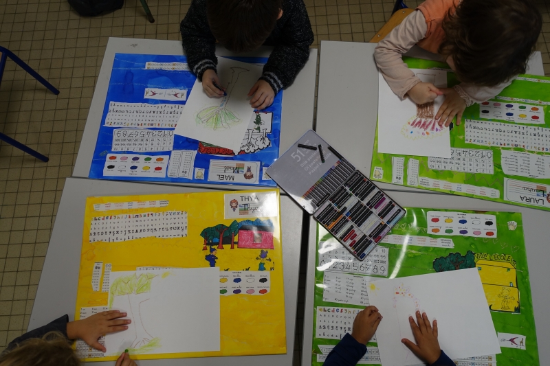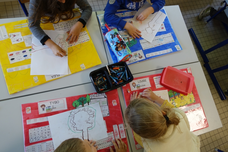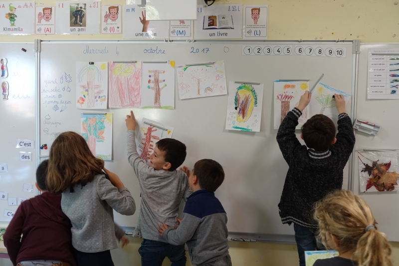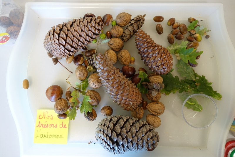 Les élèves de CP travaillent sur le thème de l’arbre et de la forêt en classe. Après s’être souvenu des sensations vécues autour du lac lors de la fête de rentrée (sentir les feuilles, toucher les troncs, les glands… écouter le bruit des feuilles dans le vent, voir les différentes feuilles…), les enfants ont apporté, de chez eux, des trésors provenant des arbres : quelques feuilles, des « fruits » (glands, noix, noisettes, châtaignes…) et même une invitée surprise : une chenille !