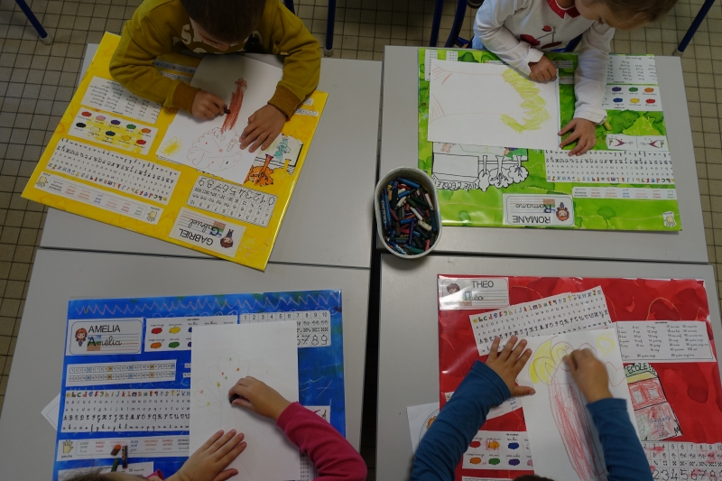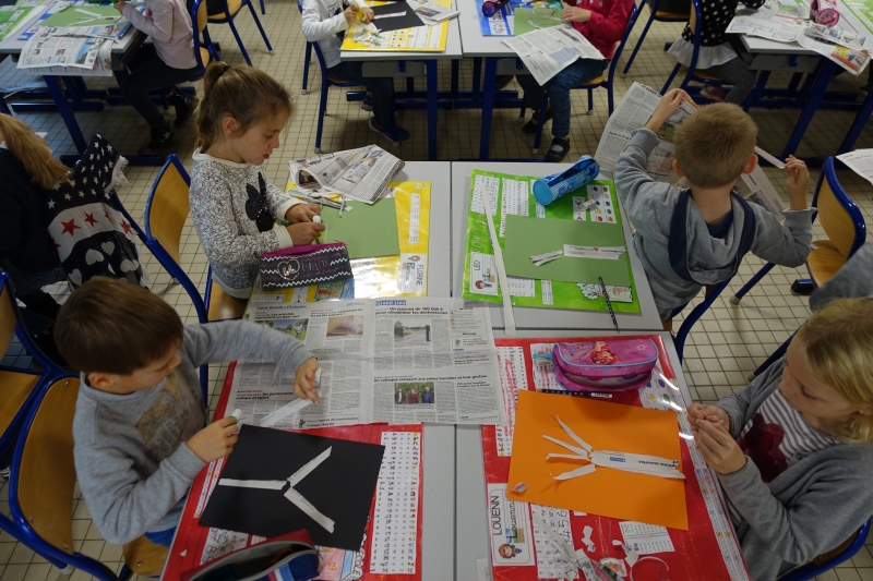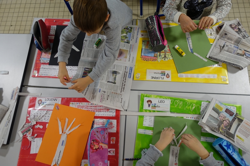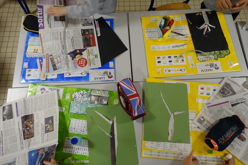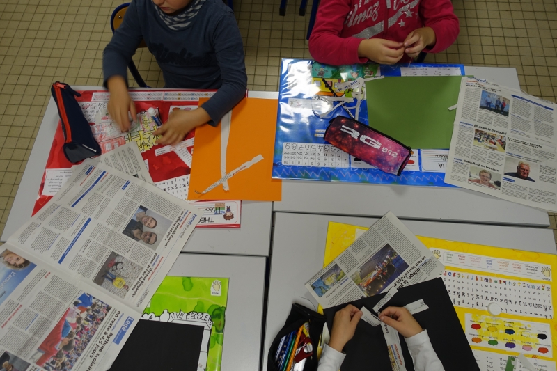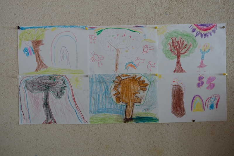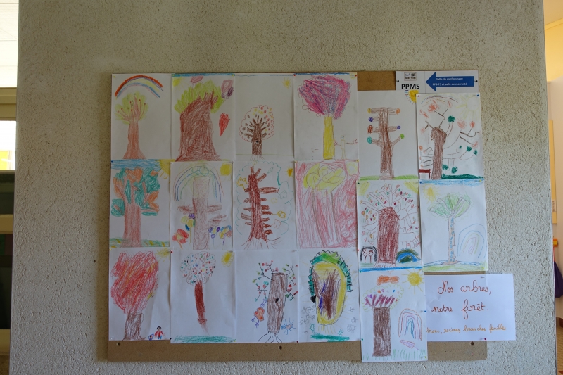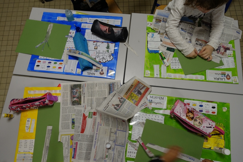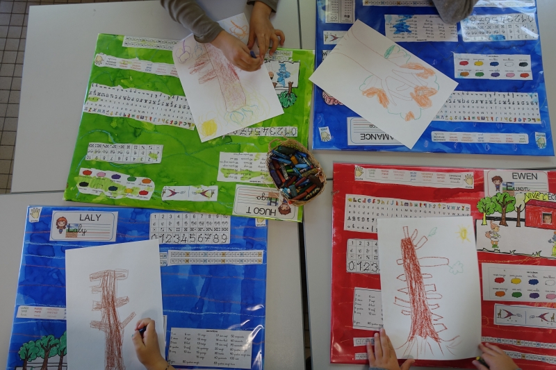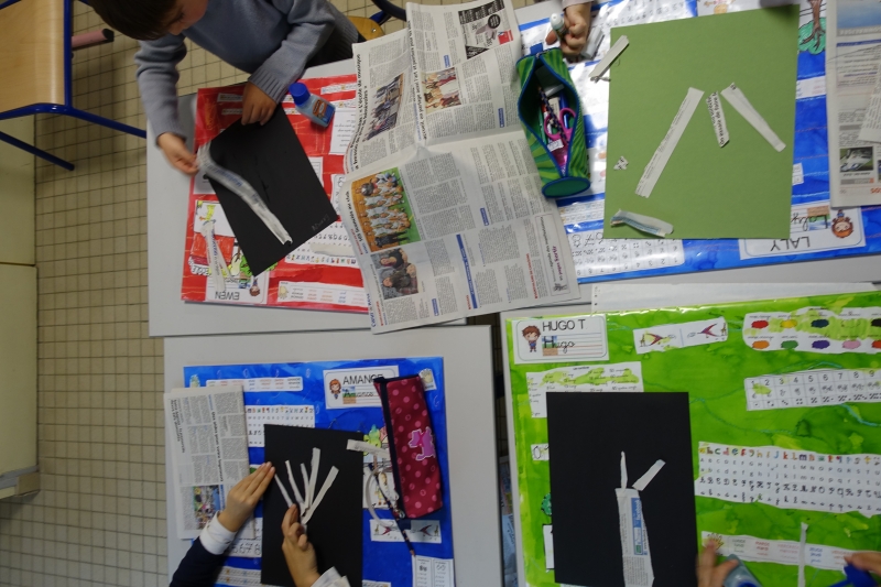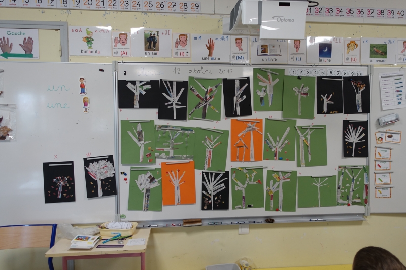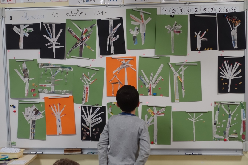 Ils ont observé comment était fait un arbre avant de dessiner leurs propres arbres à la craie grasse : dessiner un tronc, le début des racines, les branches et les feuilles ou le feuillage, le tout formant une belle forêt dans le couloir et au-dessus du lavabo. Plus tard, ils ont complété la forêt avec des arbres en papier journal sur fond noir, vert ou orange. Certains se sont attachés à créer des feuilles d’automne en trouvant les bonnes couleurs dans les pages des journaux.